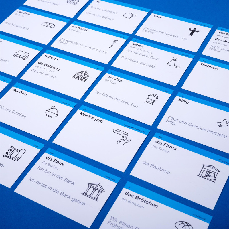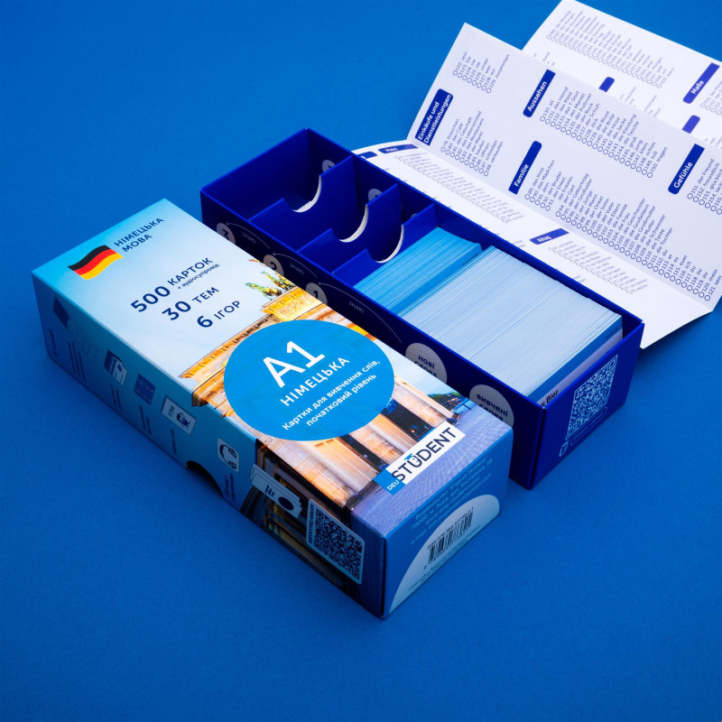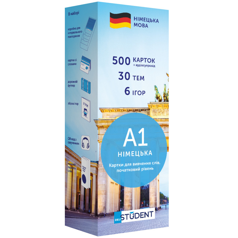 - 500 карток із німецькими словами та прикладами їх вживання (600-700 слів). На кожній картці є слово та приклад його вживання. А також невелике зображення для асоціативного запам’ятовування. На звороті - переклад;
