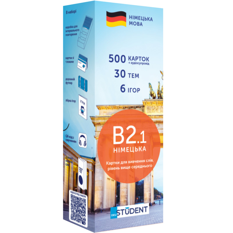 Німецька В2.1 — перша частина вище середнього рівня. Цього достатньо, щоб вільно спілкуватися з носіями мови в різних ситуаціях. Для тих, хто не зупиняється на досягнутому. В цьому наборі 708 німецьких слів та 560 прикладів їх вживання.