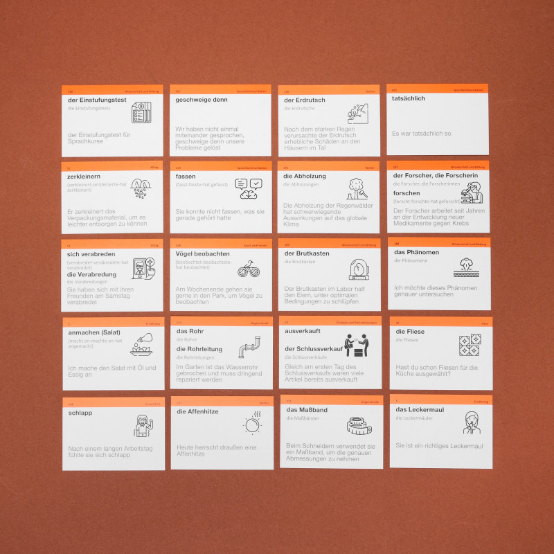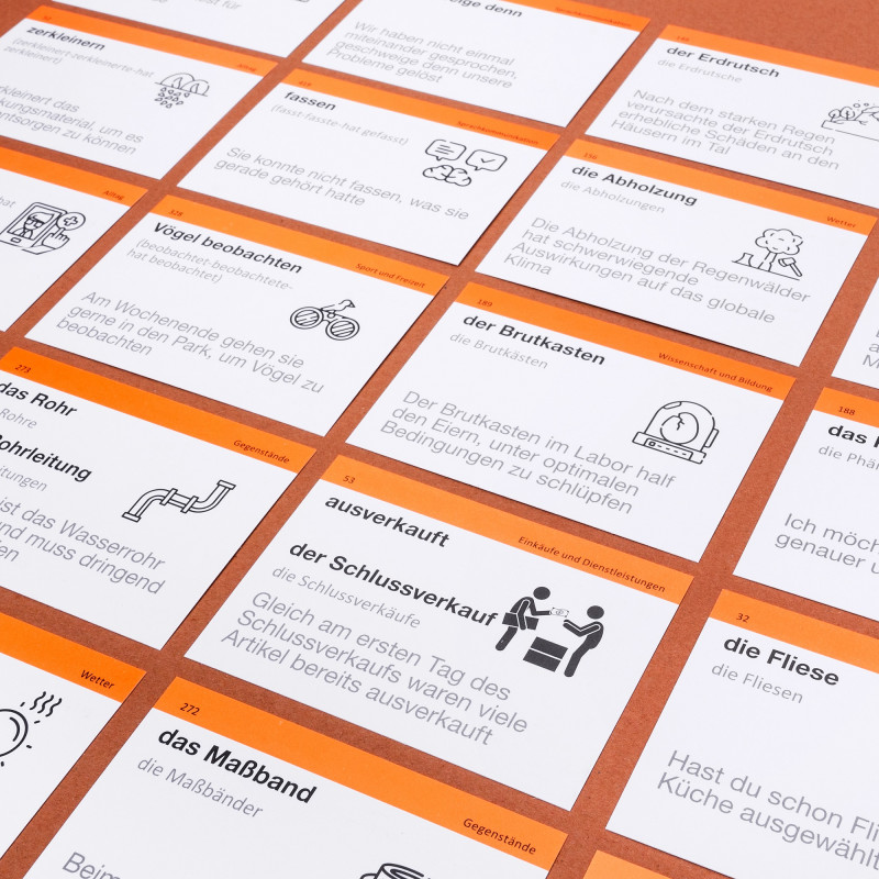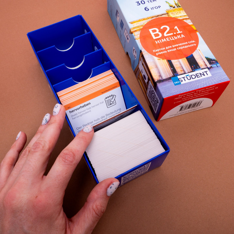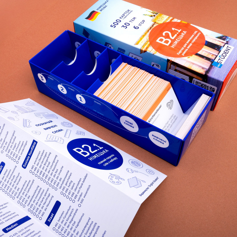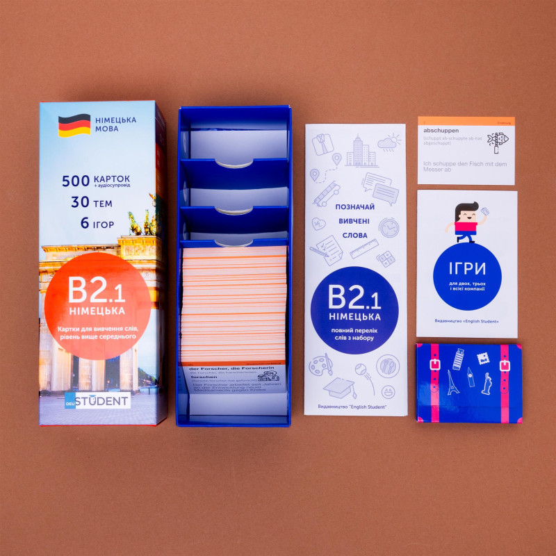 - 500 карток із німецькими словами та прикладами їх вживання (600-700 слів). На кожній картці є слово та приклад його вживання. А також невелике зображення для асоціативного запам’ятовування. На звороті - переклад;