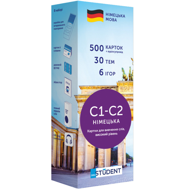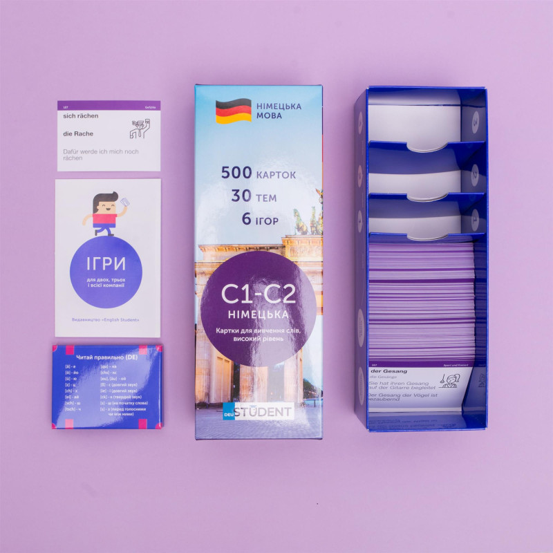 - 500 карток із німецькими словами та прикладами їх вживання. На кожній картці є слово та приклад його вживання. А також невелике зображення для асоціативного запам’ятовування. На звороті - переклад;