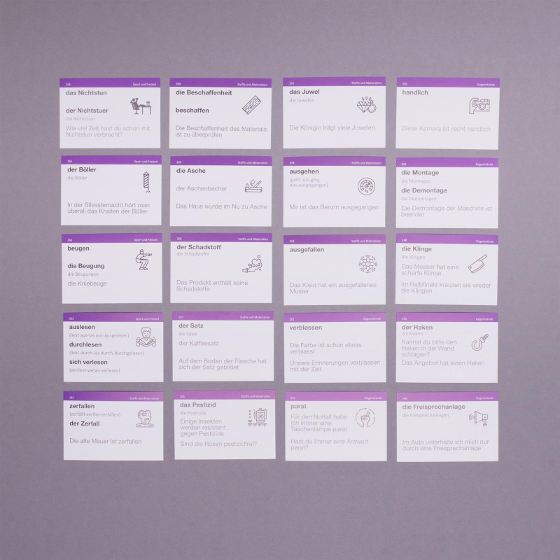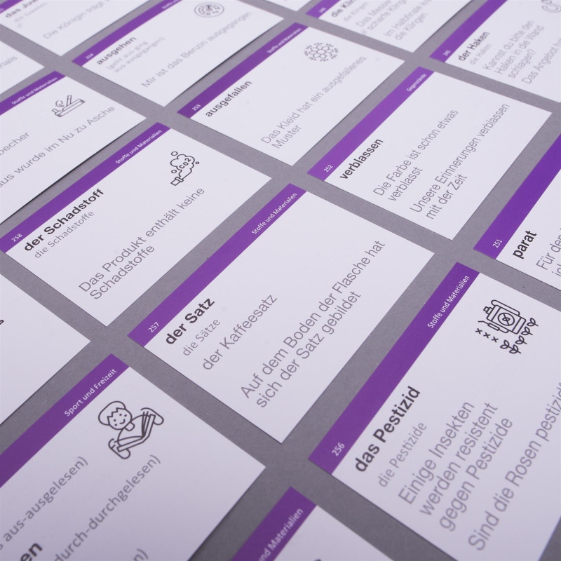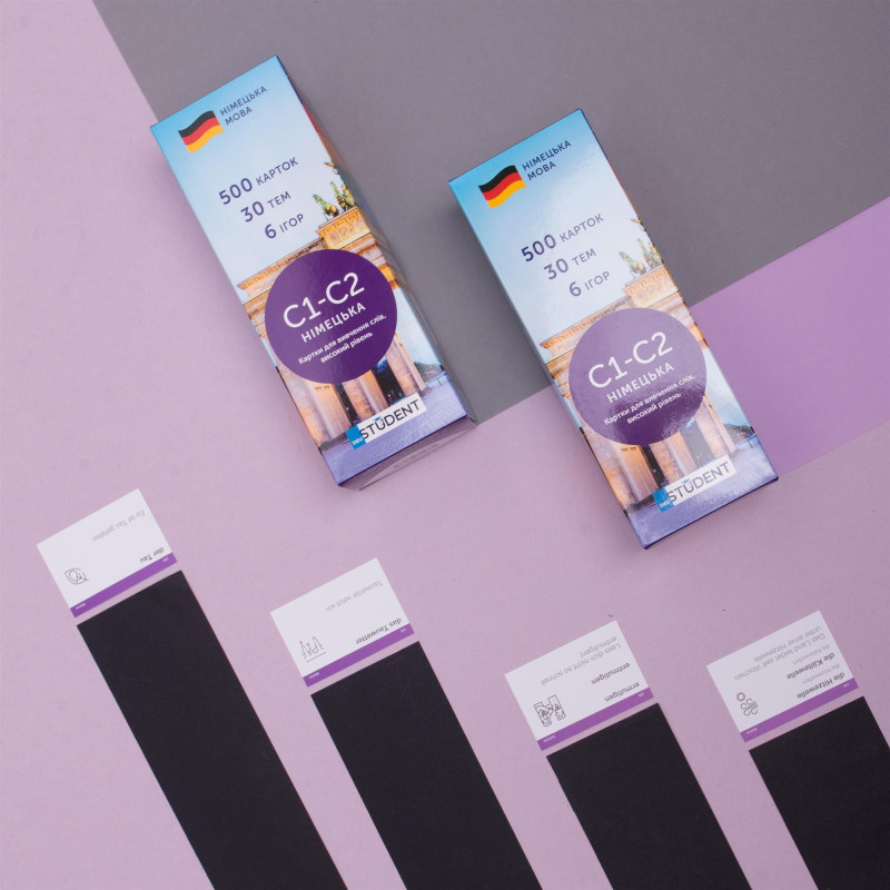 Картки для вивчення німецької на рівні С1-С2 — це просунутий набір для тих, кого не лякають довгі слова типу (der) Sommerschlussverkauf. Підійде тим, хто хоче володіти німецькою на рівні справжнього німця та стати muttersprachler. Картки допоможуть описувати з неймовірною точністю свої емоції, навколишній світ та вільно підтримувати будь-яку розмову німецькою. У цьому наборі 1048 слів та 553 приклади їх вживання.