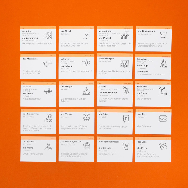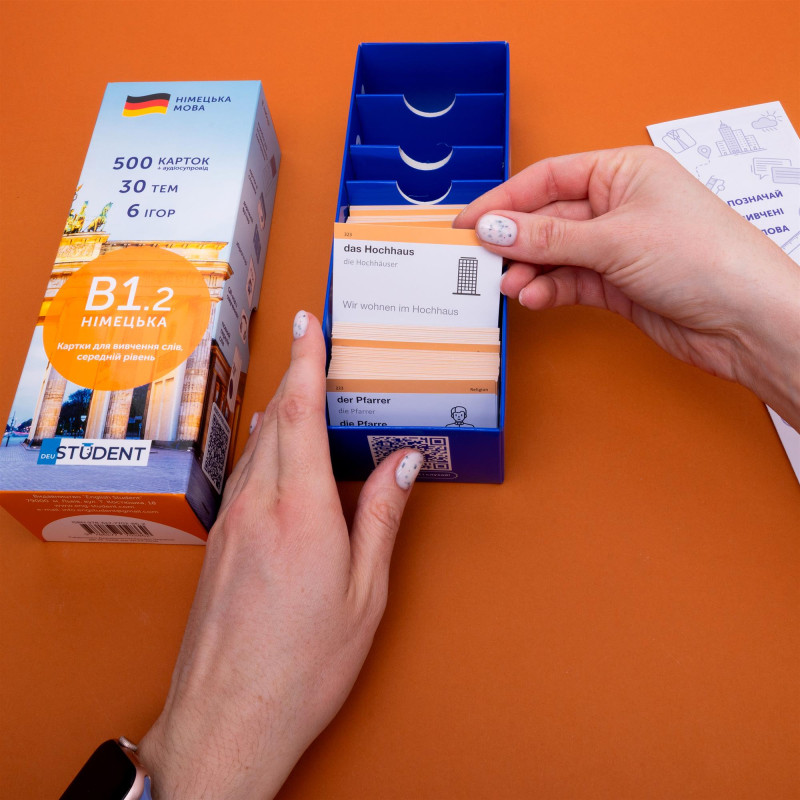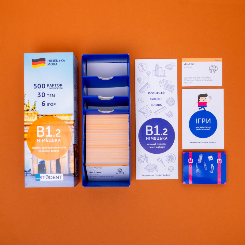- 1000 карток із німецькими словами та прикладами їх вживання (1200-1400 слів). На кожній картці є слово та приклад його вживання. А також невелике зображення для асоціативного запам’ятовування. На звороті - переклад;