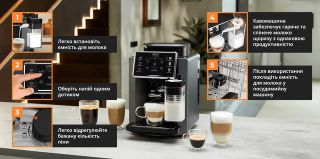 Не потрібно виливати молоко з молочника, щоб промити молочну систему. Після кожної чашки молочної кави запускається автоматичний процес промивання, що не потребує додаткових зусиль. Ємність для молока можна промити окремо в посудомийній машині, коли ви використали все молоко.