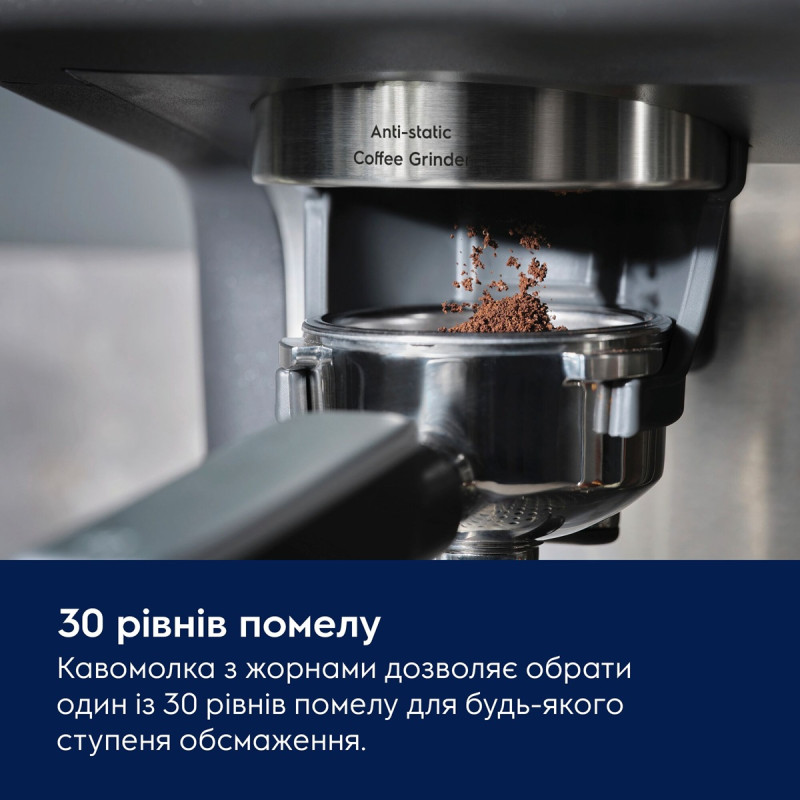 Кавомолка із вбудованими жорнами забезпечує 30 рівнів помелу для точного приготування при будь-якому ступені обсмажування зерен. При цьому, антистатична технологія кавомолки робить процес приготування кави більш чистим.