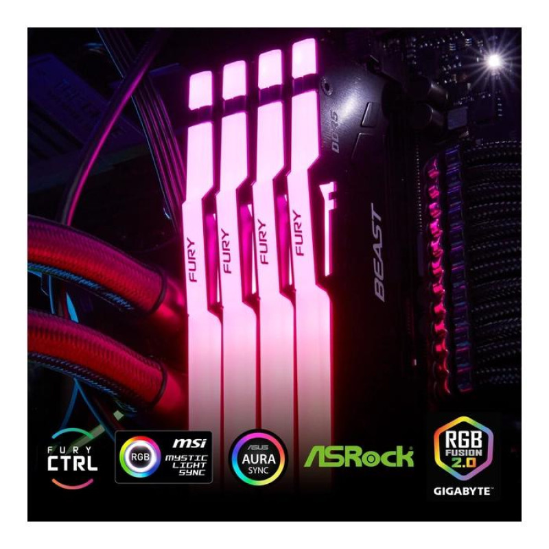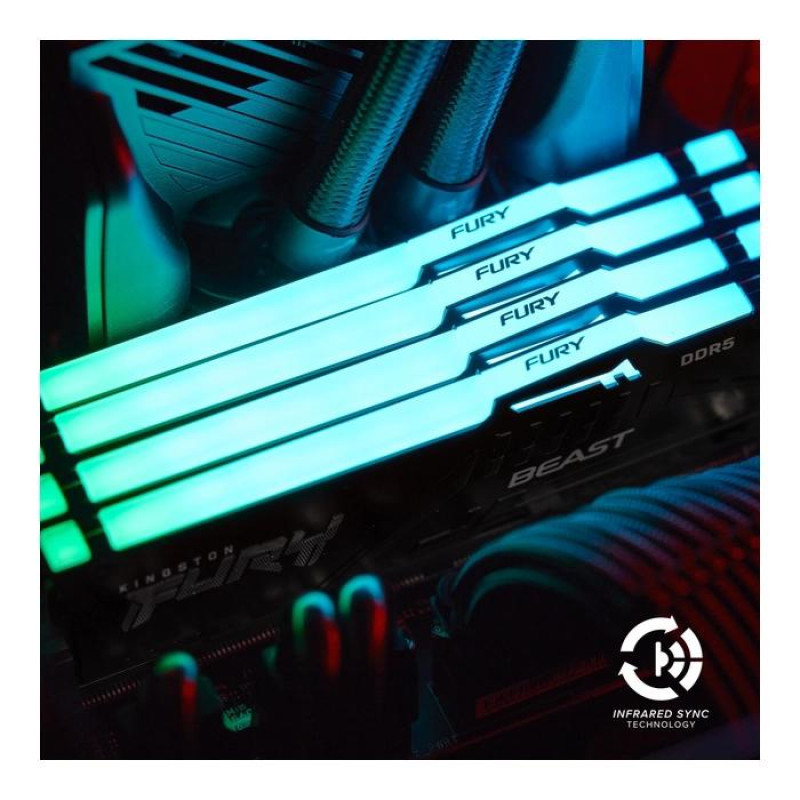 Оперативна пам'ять Kingston FURY Beast RGB DDR5 об'ємом 128 ГБ складається з двох модулів по 64 ГБ. Працює на частоті 5600 МГц із напругою 1,25 В. Оснащена алюмінієвим радіатором для стабільного тепловідведення. Підсвічування RGB синхронізується із популярними системами керування світлом.