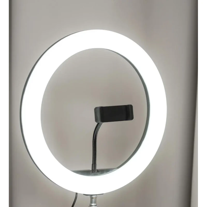 Усередині кільця лампи є внутрішнє різьблення 1/4 дюйма, в яке вкручується гнучка стійка з кріпленням телефону. Довжина цієї стійки – 15 см. Кріплення для телефону розтягується до 85 мм.