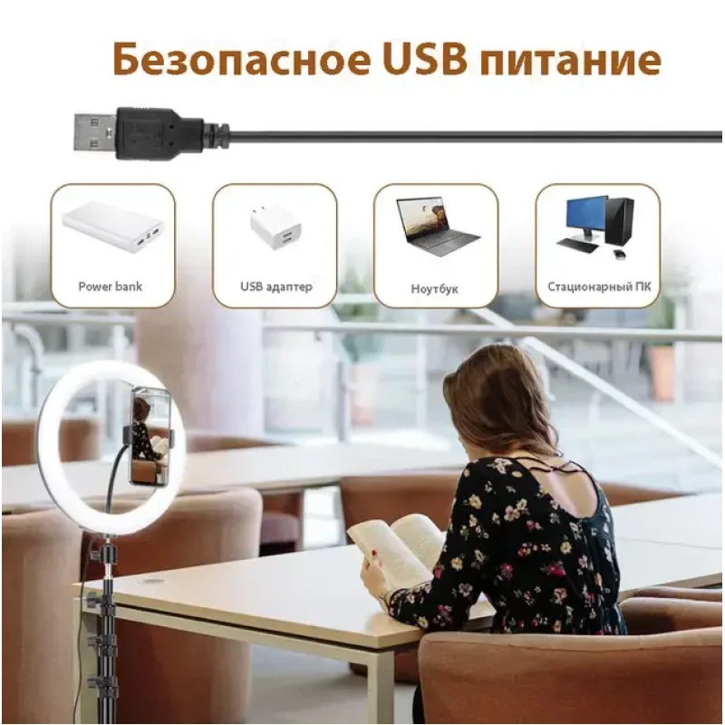 Селфі лампа отримує напругу від USB роз'єму, це дозволяє використовувати як джерело живлення PowerBank, мережевий адаптер, комп'ютер, ноутбук, завдяки чому лампу можна використовувати вдалині від мережі електроживлення, наприклад на вулиці. Ви зможете в будь-який час підключити та вимкнути лампу. Легка конструкція дозволяє швидко його зняти і закріпити назад.