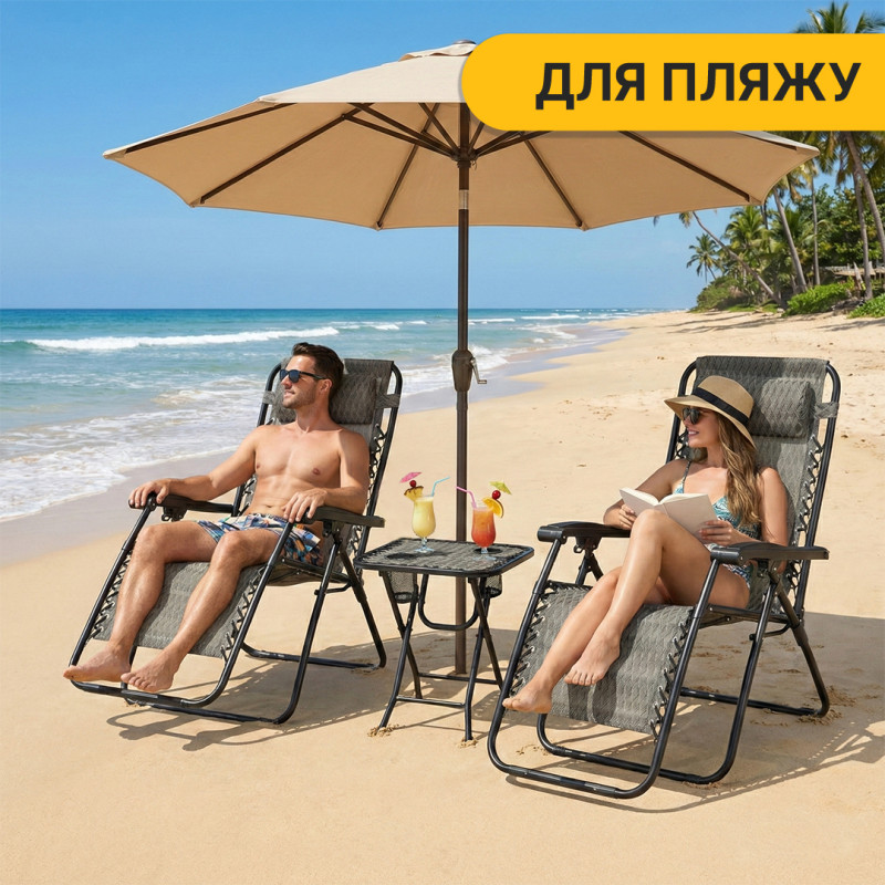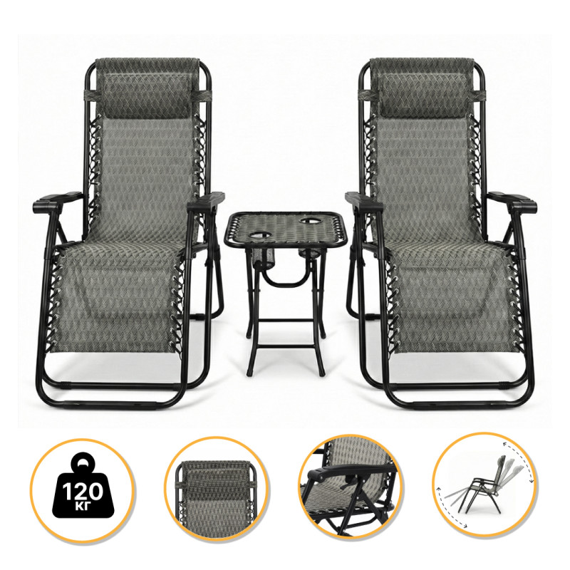 Комплект 2 розкладних крісел-шезлонгів + столик Zero Gravity LEOBRO - набір складається з двох крісел-шезлонгів і зручного столика. Ідеальний для відпочинку на природі, терасі або дачі — стильний, ергономічний та комфортний.