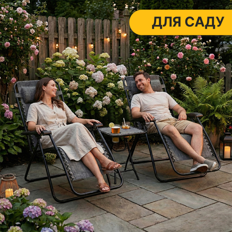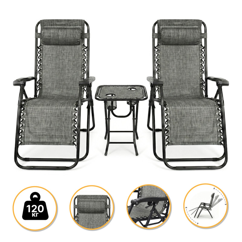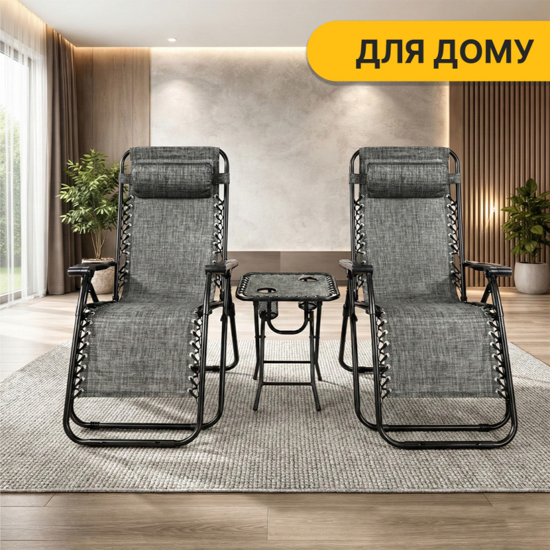 Комплект 2 розкладних крісел-шезлонгів + столик Zero Gravity LEOBRO - набір складається з двох крісел-шезлонгів і зручного столика. Ідеальний для відпочинку на природі, терасі або дачі — стильний, ергономічний та комфортний. Основні характеристики: Ергономічний дизайн: крісла повторюють природні вигини тіла, забезпечуючи оптимальну підтримку спини. Функція Zero Gravity: спеціальний механізм рівномірно розподіляє вагу тіла, створюючи ефект невагомості та зменшуючи навантаження на хребет. Міцний каркас: сталева труба з порошковим покриттям. Комфортна тканина: дихаючий текстиль, легко очищується. Регульована спинка і підголівник: можливість налаштувати положення для максимального комфорту. Зручний столик: має тримачі для напоїв і місце для дрібних речей, таких як книги чи смартфони. Комплектація: 2 розкладні крісла-шезлонги Zero Gravity LEOBRO 1 столик Комплект LEOBRO Zero Gravity — поєднання стилю, комфорту та функціональності.