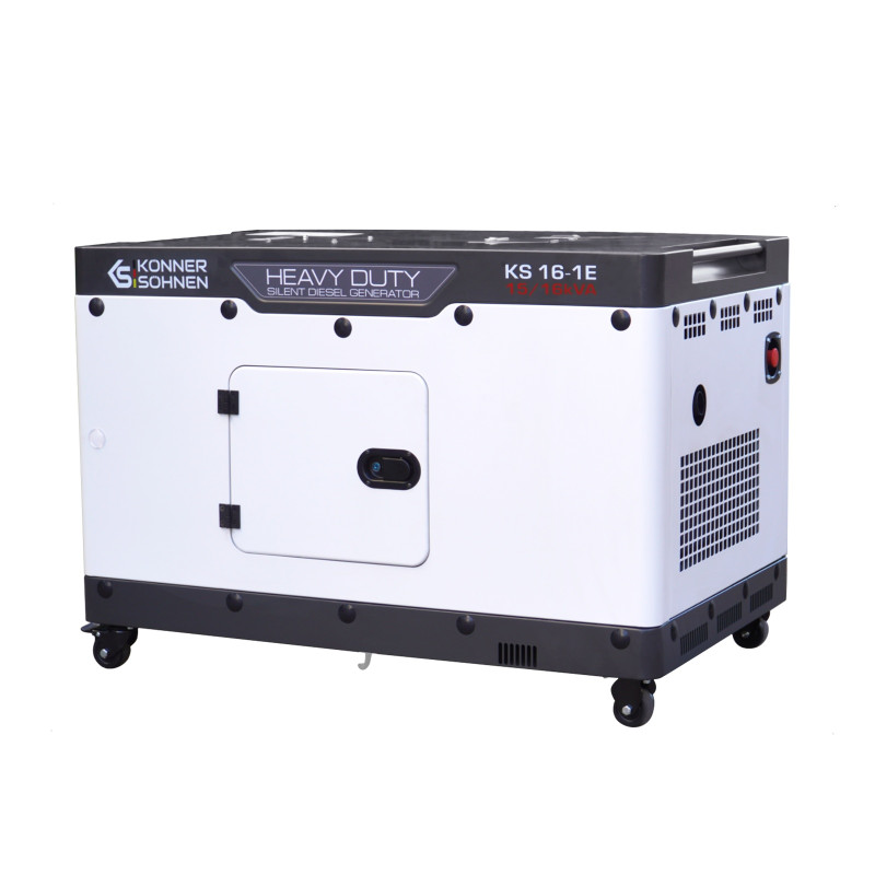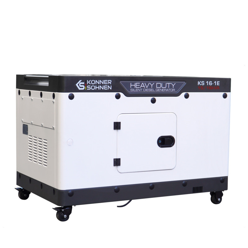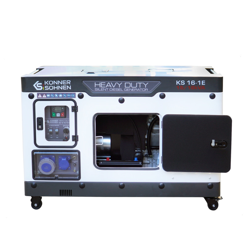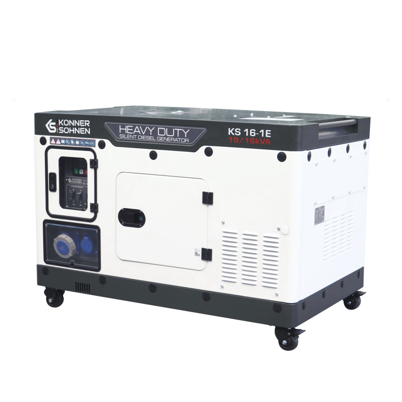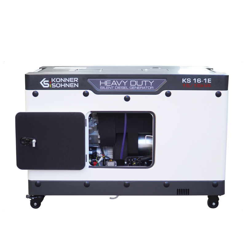 Дизельний генератор KS 16-1E видає номінальну потужність 15 кВт (максимальна 16 кВт) при однофазній напрузі 230 В і оснащений двоциліндровим V-подібним двигуном з повітряним охолодженням. Шумозахисний корпус знижує рівень звуку до 76 дБ на відстані 7 м і захищає агрегат від вологи та пилу. Багатофункціональний контролер SMARTGEN HGM501 забезпечує мониторинг параметрів, автоматичний або ручний запуск та захист від основних аварійних режимів. Передстартовий підігрів та посилений аккумулятор 45 А·год дозволяють запускати станцію при низьких температурах.