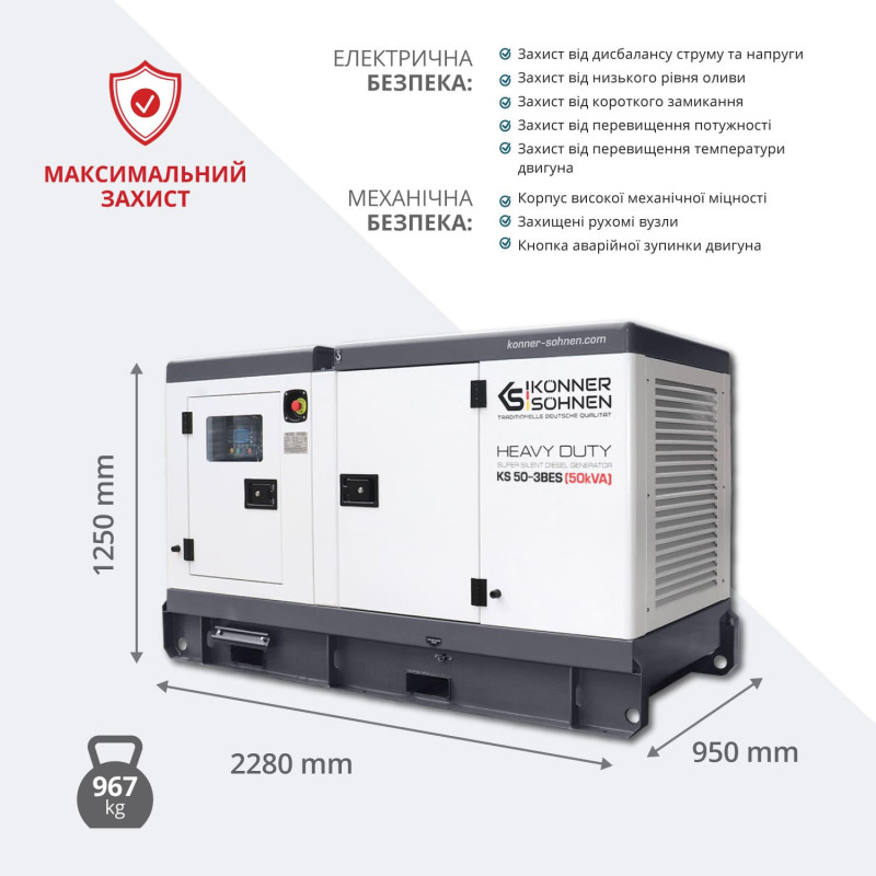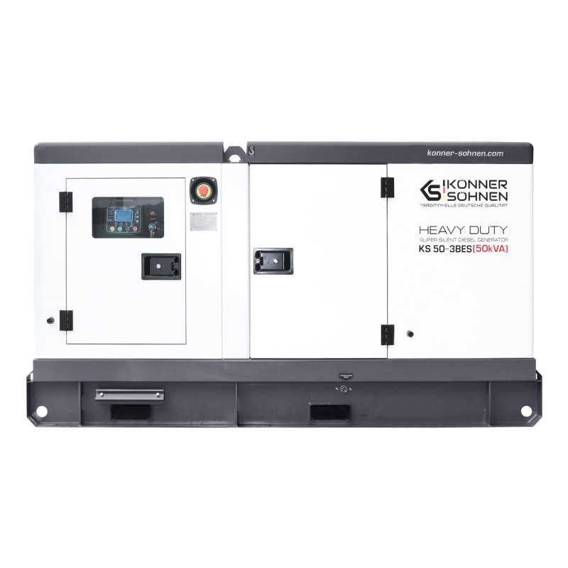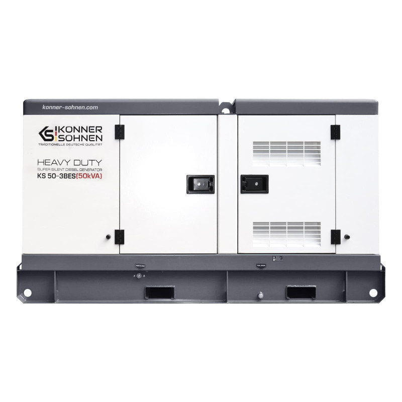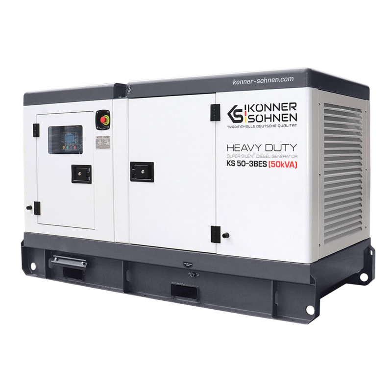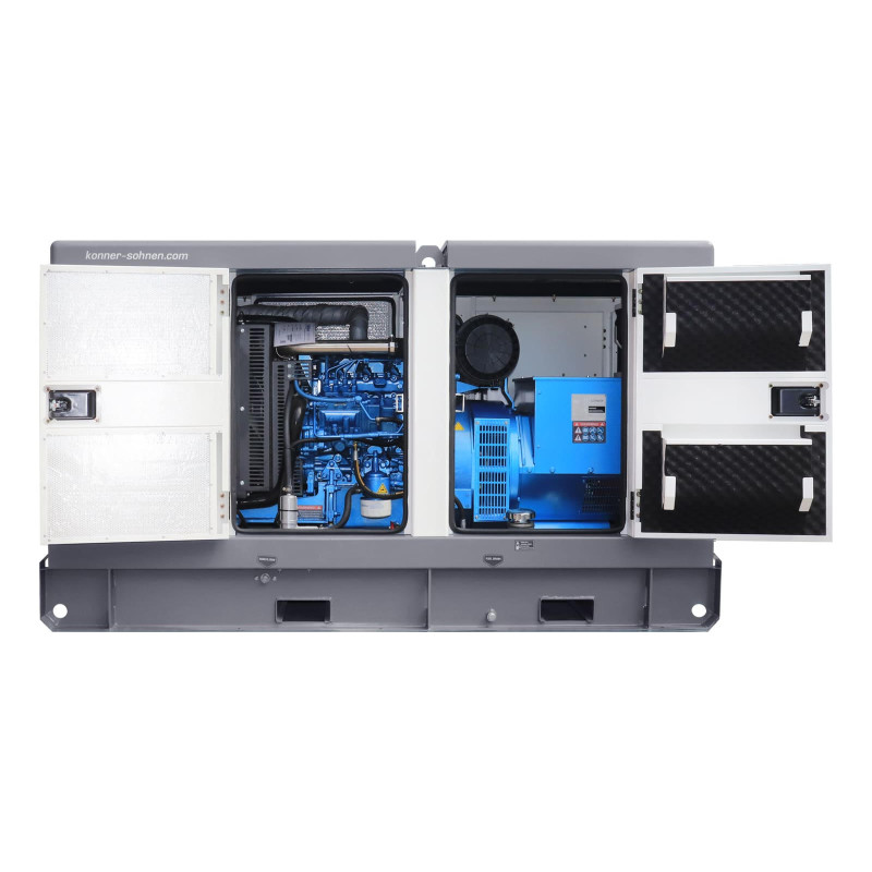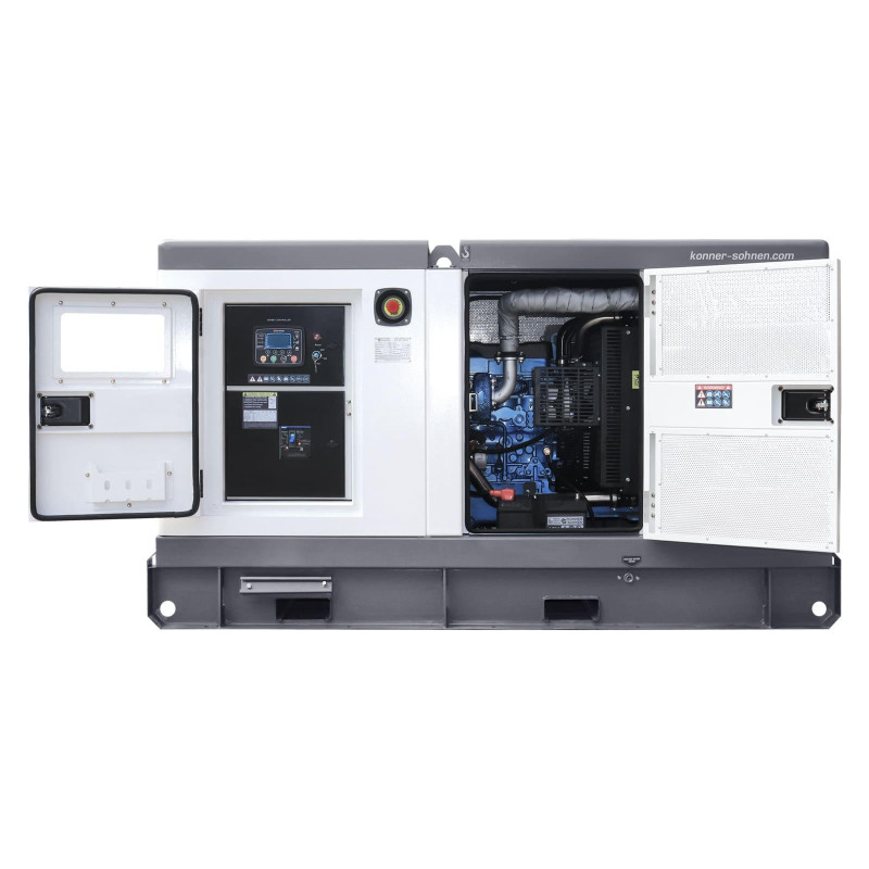 Дизельний генератор Konner&Sohnen KS 50-3BES видає номінальну потужність 45 кВА та максимальну 50 кВА при 230/400 В у трифазному режимі. Водяне охолодження двигуна Baudouin забезпечує стабільну роботу в спекотних умовах, а шумозахисний корпус тримає рівень шуму на 68 дБ. Передстартовий підігрів полегшує запуск при низьких температурах, а контролер Datakom D300 контролює параметри та сигналізує про несправності. Підтримка ATS дозволяє автоматичного переходу на резервне живлення.