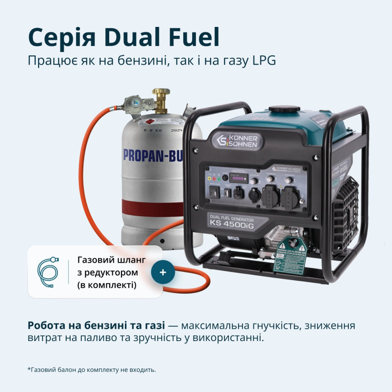 Двопаливний інверторний генератор KS 4500iG (4,2 кВт на бензині, 3,8 кВт на газі) забезпечує стабільне електроживлення для медичного обладнання, лабораторних приладів, серверів, систем збереження даних та ін. Інверторна технологія гарантує чисту синусоїду – безпечно для чутливої електроніки. Працює на бензині та газі (LPG), знижуючи витрати та викиди. У комплекті — шланг 1,5 м та редуктор. Оснащення надежним двигуном K&S (EURO V), LED-дисплеєм, розетками 16А, 12В, USB QC 3.0, Type-C. Має економний режим, компактний та зручний у транспортуванні.