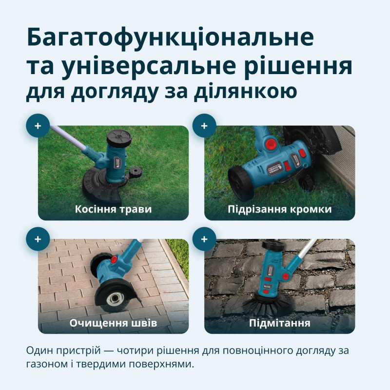 Акумуляторний багатофункційний тример Kоnner & Sоhnen® KSMFT-20V — універсальний інструмент для догляду за подвір’ям: косіння волосінню чи пластиковими ножами, підрізання кромок, підмітання доріжок і очищення швів між плитками. Змінні робочі блоки встановлюються швидко, опорне колесо допомагає вести рівну лінію, а поворотна рукоятка та регулювання моторного блоку підвищують контроль і зручність.