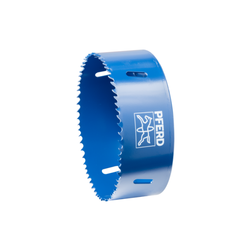 Корончаста фреза PFERD HSS 114 мм - біметалева корончаста фреза з міцної HSS сталі для свердлильних верстатів і ручних дрилів. Призначена для монтажу сантехнічних та опалювальних труб, вирізання отворів у мийках, вбудовування галогенного освітлення, розеток з порожніми стінками, кришок кабельних вводів та витяжних труб. Рекомендується використовувати високоякісне мастило для охолодження та підвищення зносостійкості інструменту. Для роботи потрібен адаптер AS-PSL + центрувальне свердло LSB або швидкозатискна система PS + центрувальне свердло LSB.