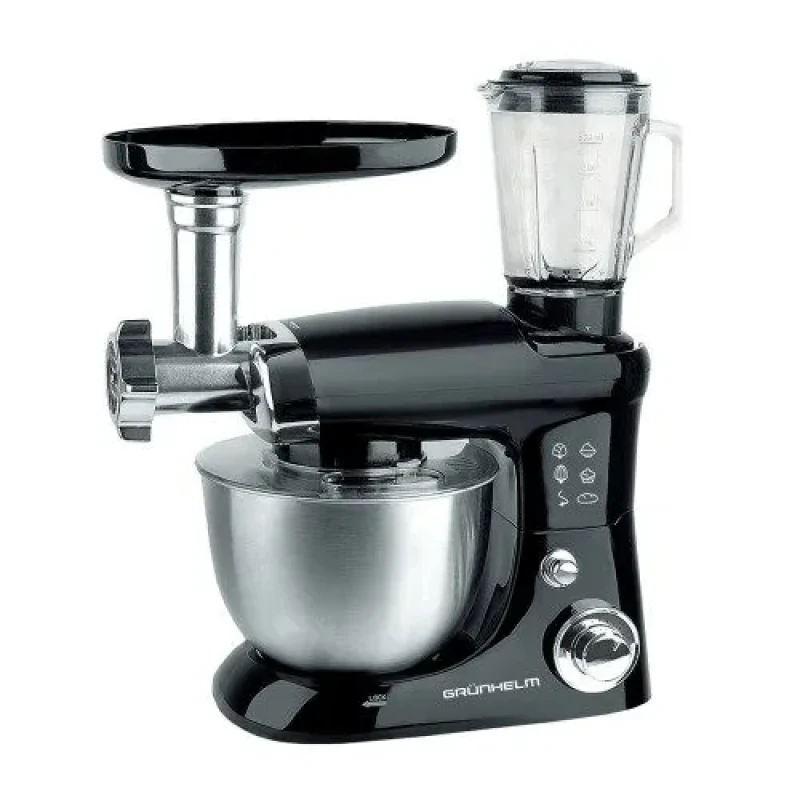 Кухонний комбайн GKM0016B Grunhelm – стане незамінним помічником на Вашій кухні. Модель обладнана планетарним міксером, м’ясорубкою і скляним блендером. Машина оснащена функціями замісу тіста, подрібнення, збивання, перемішування, подрібнення, приготування напоїв і фаршу. Знімна чаша об’ємом 4 л виготовлена з нержавіючої сталі. Для зручного використання передбачено 6 швидкостей, які регулюються за допомогою ручки.