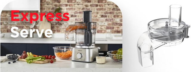 Кухонний комбайн Kenwood FDP 65.820SI оснащений терками та дисками для натирання та нарізування овочів, за допомогою яких можна легко приготувати салат чи нарізку до столу. А насадка експрес подачі Express Serve робить процес нарізування максимально комфортним – усі овочі потрапляють прямо у посуд.