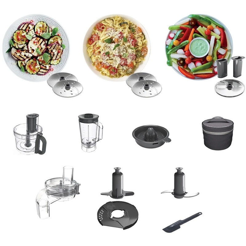 Кухонний комбайн Kenwood FDP 65.820SI – це потужний та компактний побутовий прилад, який оснащений усім необхідним, щоб легко впоратися з будь-якими кулінарними завданнями. Комбайн збиває, змішує, подрібнює, шаткує, замішує тісто, отримує сік з цитрусових і не тільки. Завдяки високій потужності він легко справляється з переробкою навіть твердих продуктів, а дві швидкості дають можливість адаптувати можливості комбайна до конкретного завдання.