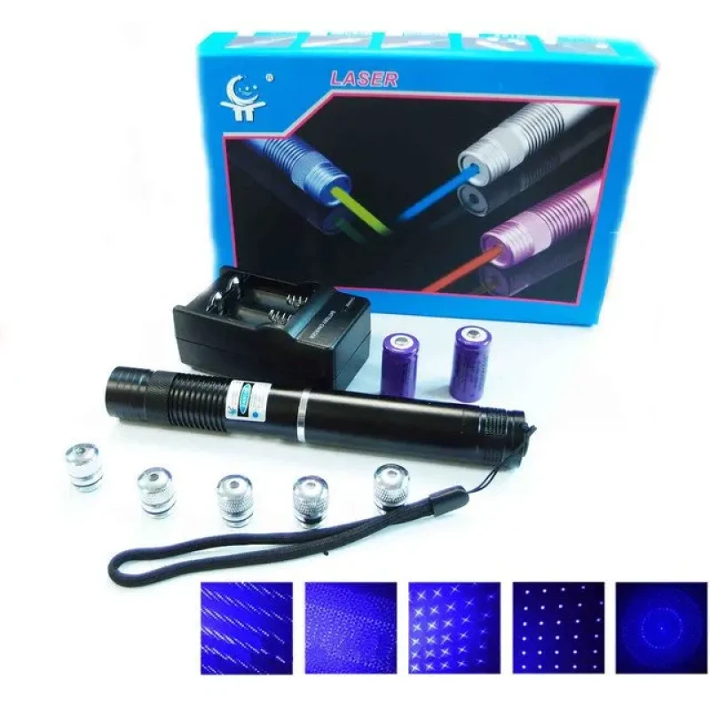 Синій лазер 10000mW Pro (445nm) YX-B008 з додатковими насадками - запалює сірники, пропалює пластик, папір та тканину! Фіксована кнопка фіксації в робочому положенні (кнопку вже не потрібно постійно притримувати пальцем). Постачається додатково зі змінними насадками "Зоряне небо"