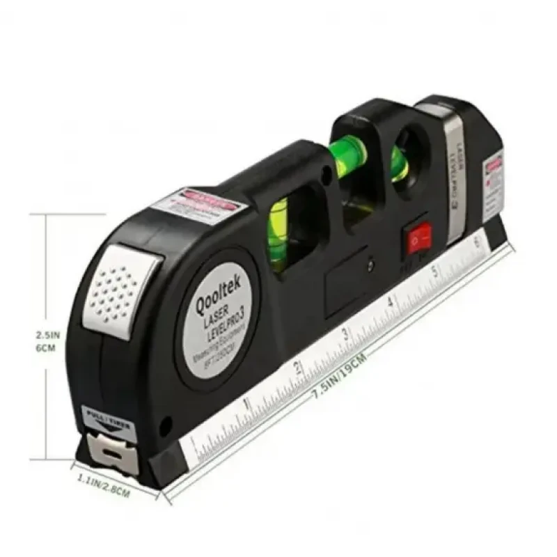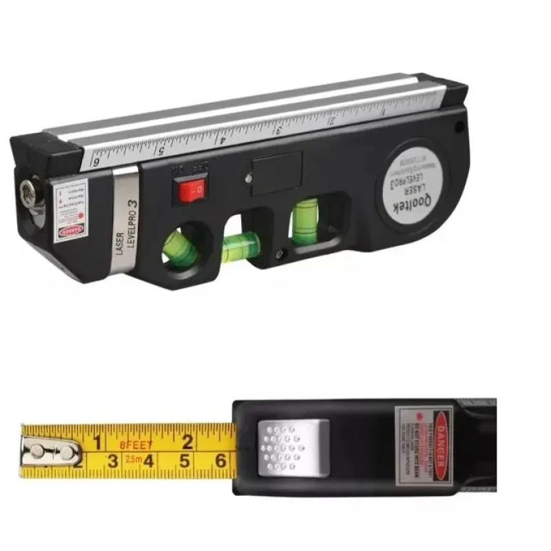 Це вимірювальний прилад 4 в 1 оснащений рулеткою (2,5 м), рідинними трьома рівнями та лазерним рівнем, 15-сентиметрова лінійка