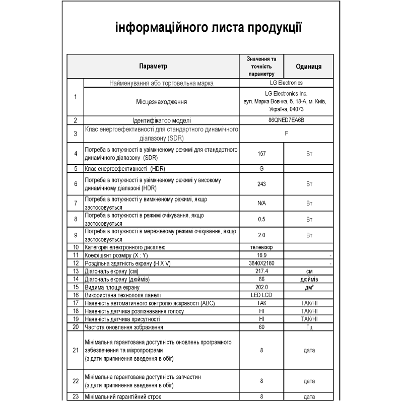 Діагональ екрану: 86" Роздільна здатність: 3840 x 2160 (4K Ultra HD)
