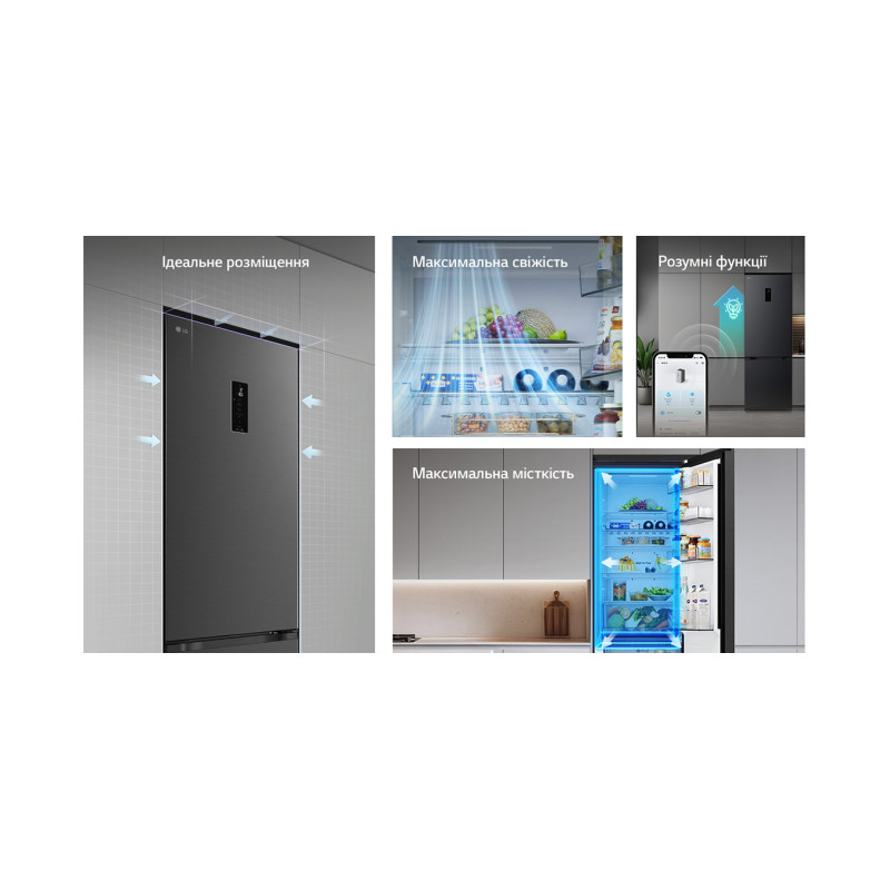 Холодильник LG GC-B509ETTM з нижньою морозильною камерою має загальний корисний об'єм 375 л (262 л холодильне відділення + 113 л морозильне). Пристрій оснащений інверторним компресором, системою Total No Frost, технологією DoorCooling+ та зовнішнім LED-дисплеєм. Зони Fresh Balancer і Fresh Converter дозволяють точно регулювати вологість і температуру для різних продуктів. Річне споживання енергії становить 263 кВт·год (клас E), рівень шуму - 35 дБ. Гарантія - 1 рік повна + 10 років на компресор.