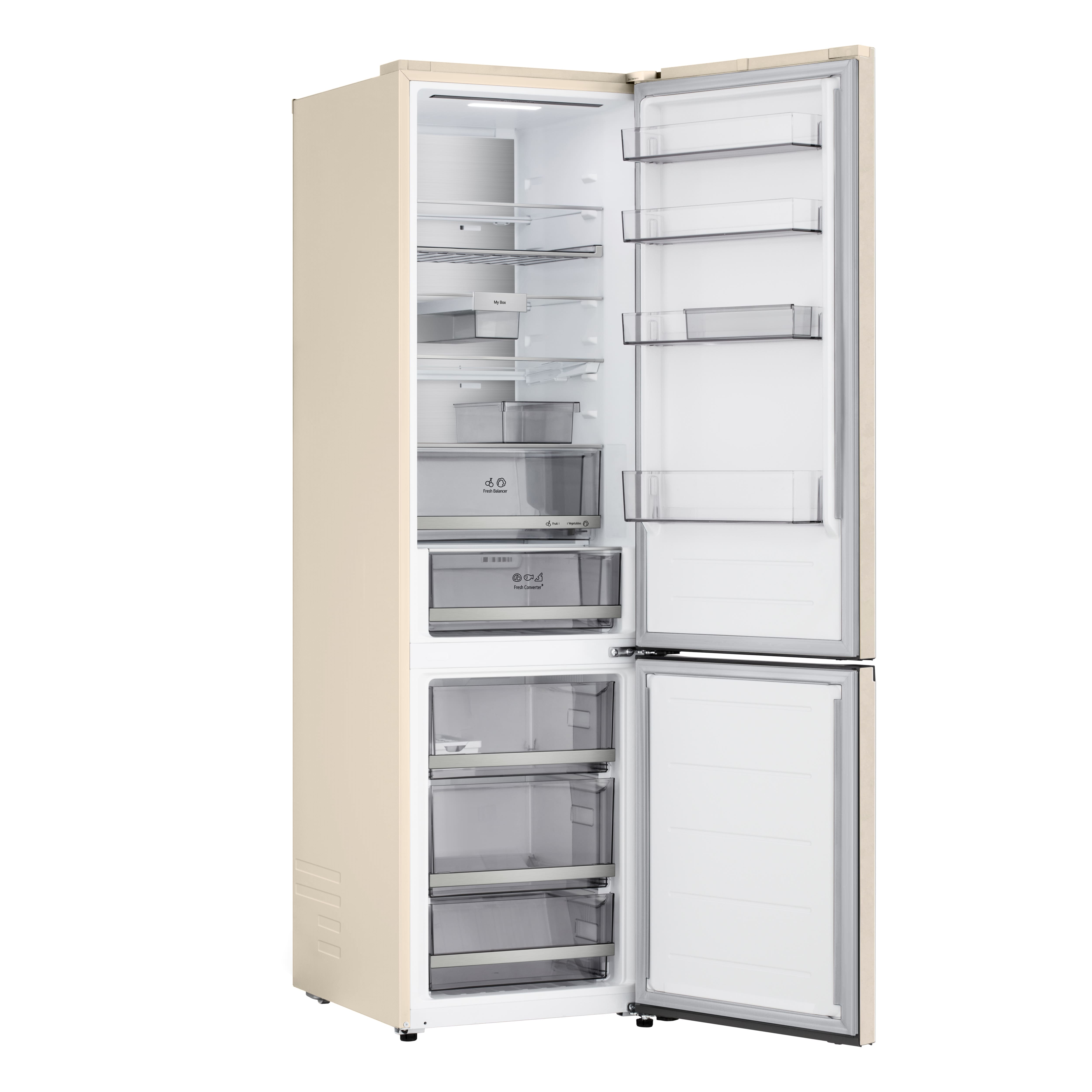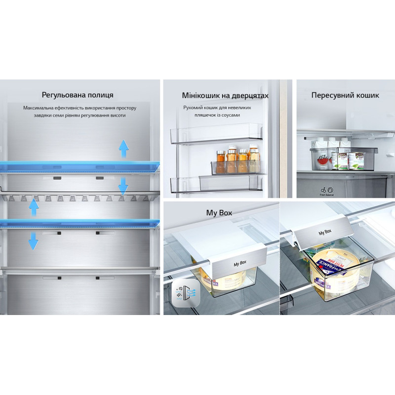 Холодильник LG GC-B509EEKM з нижньою морозильною камерою має загальний корисний об'єм 375 л (262 л холодильне відділення + 113 л морозильне). Пристрій оснащений інверторним компресором, системою Total No Frost, технологією DoorCooling+ та зовнішнім LED-дисплеєм. Зони Fresh Balancer і Fresh Converter дозволяють точно регулювати вологість і температуру для різних продуктів. Річне споживання енергії становить 263 кВт·год (клас E), рівень шуму - 35 дБ. Гарантія - 1 рік повна + 10 років на компресор.