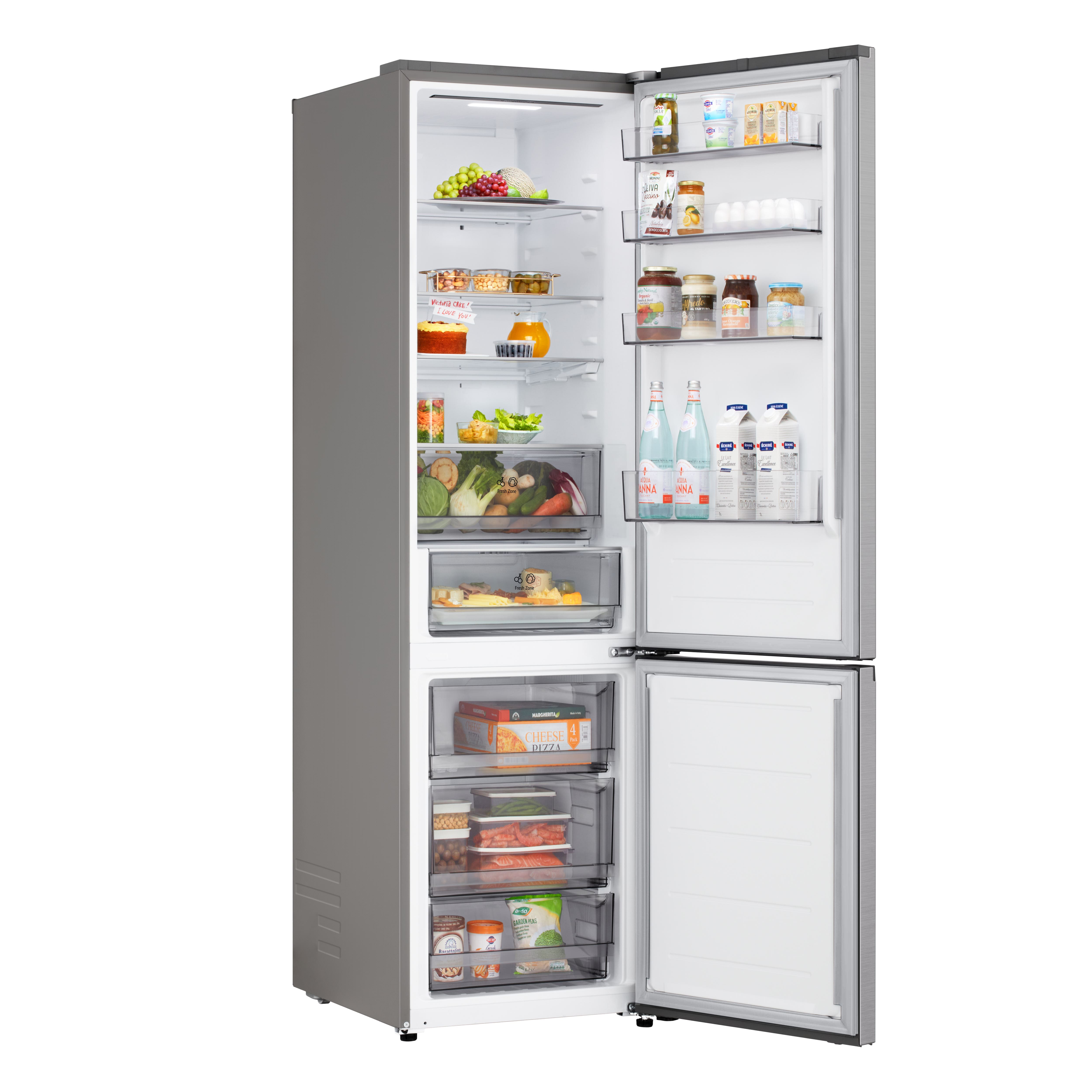 Холодильник LG GC-B509EMLM з нижньою морозильною камерою має загальний корисний об'єм 375 л (262 л холодильне відділення + 113 л морозильне). Пристрій оснащений інверторним компресором, системою Total No Frost, технологією DoorCooling+ та зовнішнім LED-дисплеєм. Зона свіжості Fresh Zone підтримує оптимальні умови для тривалого зберігання продуктів. Річне споживання енергії становить 263 кВт·год (клас E), рівень шуму - 35 дБ. Гарантія - 1 рік повна + 10 років на компресор.