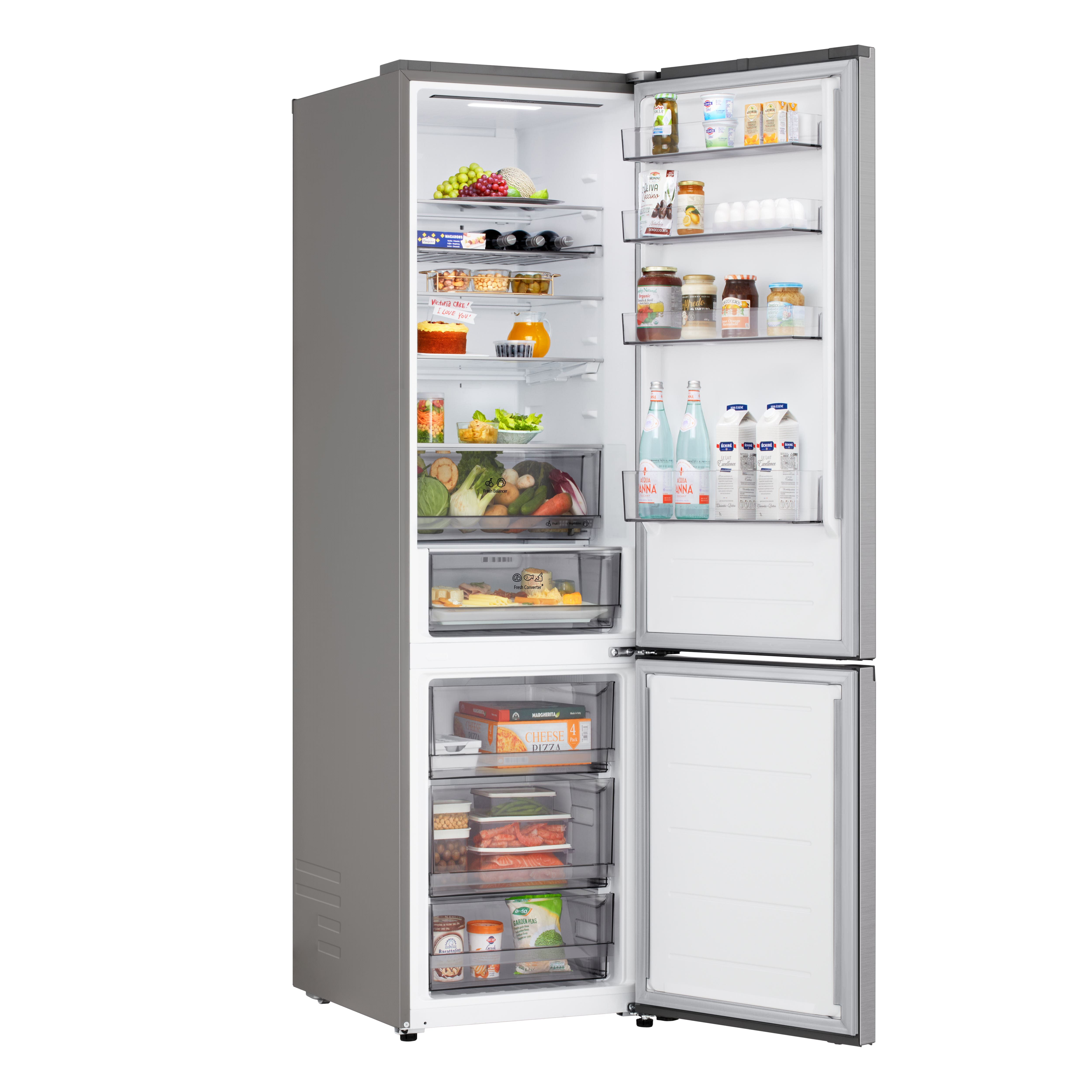 Холодильник LG GC-B509EMTM з нижньою морозильною камерою має загальний корисний об'єм 375 л (262 л холодильне відділення + 113 л морозильне). Пристрій оснащений інверторним компресором, системою Total No Frost, технологією DoorCooling+ та зовнішнім LED-дисплеєм. Зони Fresh Balancer і Fresh Converter дозволяють точно регулювати вологість і температуру для різних продуктів. Річне споживання енергії становить 263 кВт·год (клас E), рівень шуму - 35 дБ. Гарантія - 1 рік повна + 10 років на компресор.
