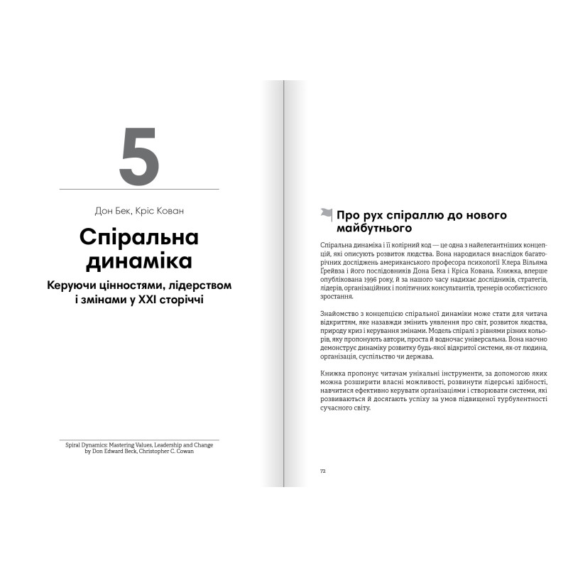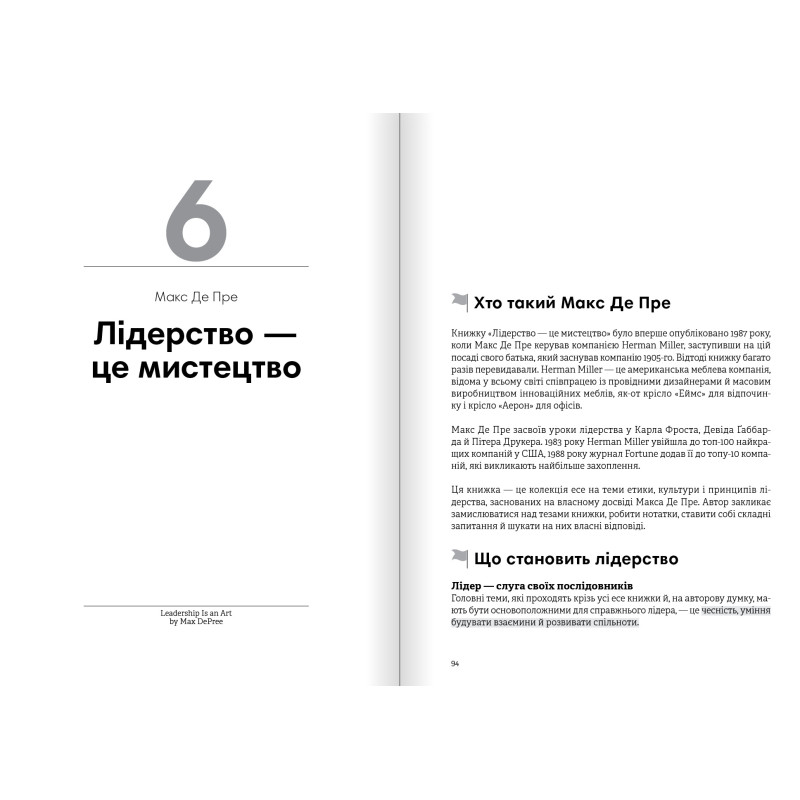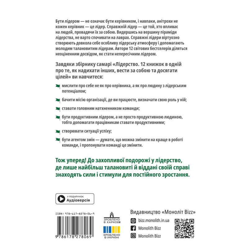Бути лідером — не означає бути керівником, і навпаки, анітрохи не кожен керівник — це лідер. Справжній лідер — це той, хто впливає на людей, провадячи їх за собою. Видершись на вершину піраміди лідерства, не варто спочивати на лаврах. Справжні лідери віртуозно створюють довкола себе особливу лідерську атмосферу, допомагають молодим талановитим лідерам і щедро діляться своїми знаннями. Навчитися всього цього можна, прочитавши збірник самарі «Лідерство. 12 книжок одній про те, як надихати інших, вести за собою та досягати цілей». Автори світових бестселерів діляться неоціненним досвідом, як стати непересічним лідером.
