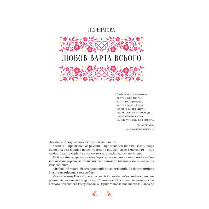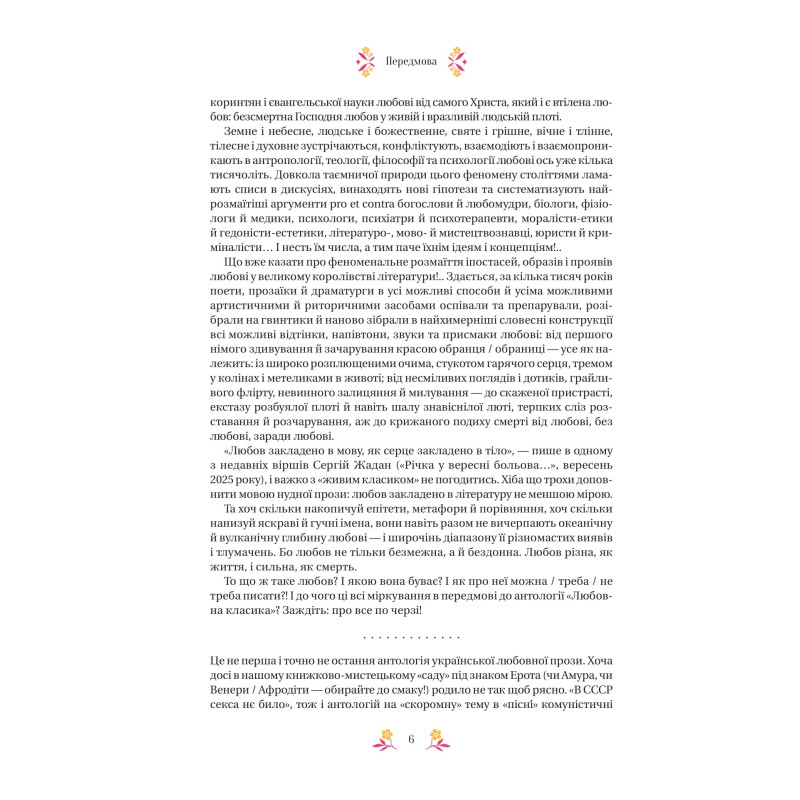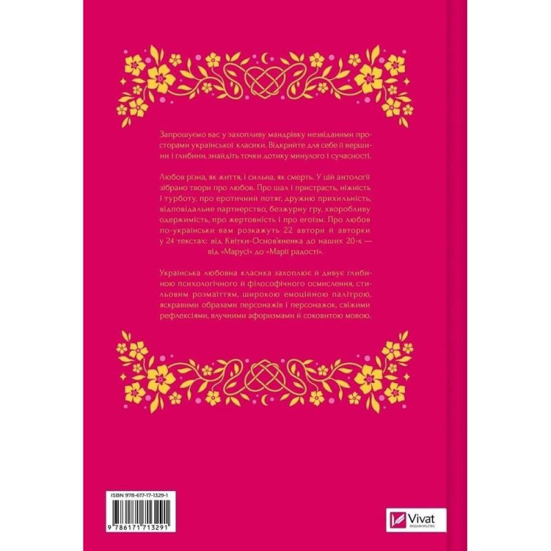 Анотація: Любов різна, як життя, і сильна, як смерть. У цій антології зібрано твори про любов. Про шал і пристрасть, ніжність і турботу, про еротичний потяг, дружню прихильність, відповідальне партнерство, безжурну гру, хворобливу одержимість, про жертовність і про егоїзм. Про любов по-українськи вам розкажуть 22 автори й авторки у 24 текстах: від Квітки-Основ’яненка до наших 20-х — від «Марусі» до «Марії радості».