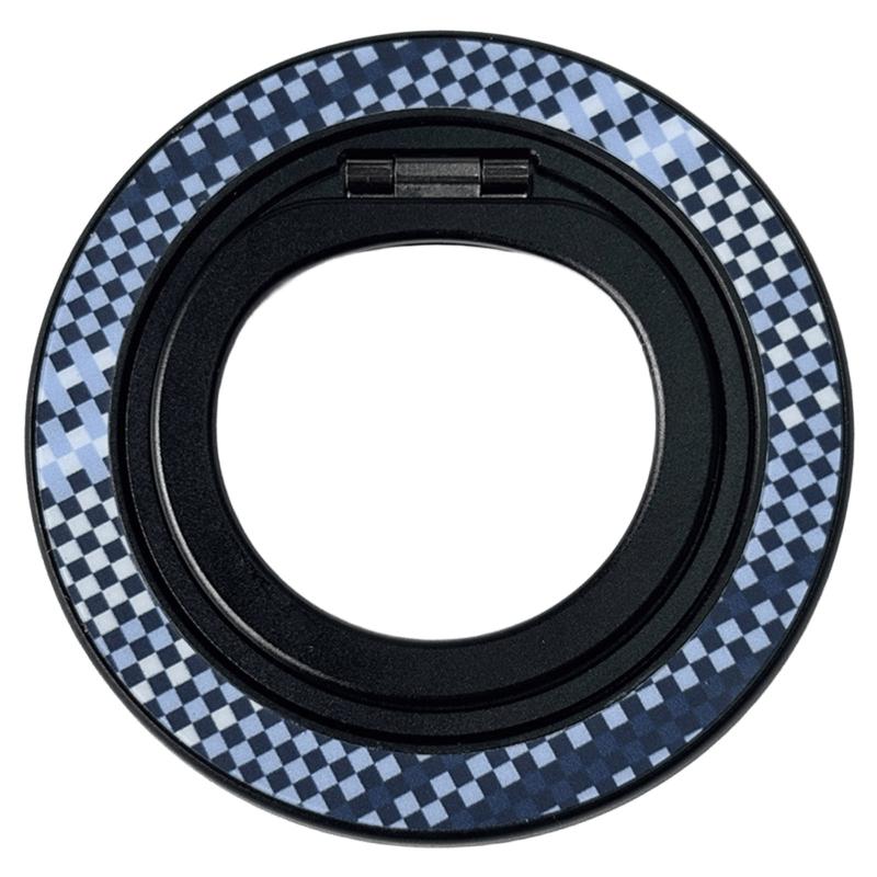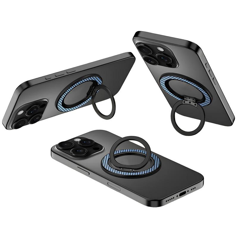 Цей аксесуар виготовлений з міцного металу та кріпиться до пристрою за допомогою магнітів, що забезпечує надійне утримання телефону. Він може використовуватися як підставка для перегляду відео під різними кутами, завдяки можливості нахилу на 180° та обертання на 360°. Крім того, кільце-тримач підтримує бездротову зарядку, що робить його ще більш зручним у використанні.