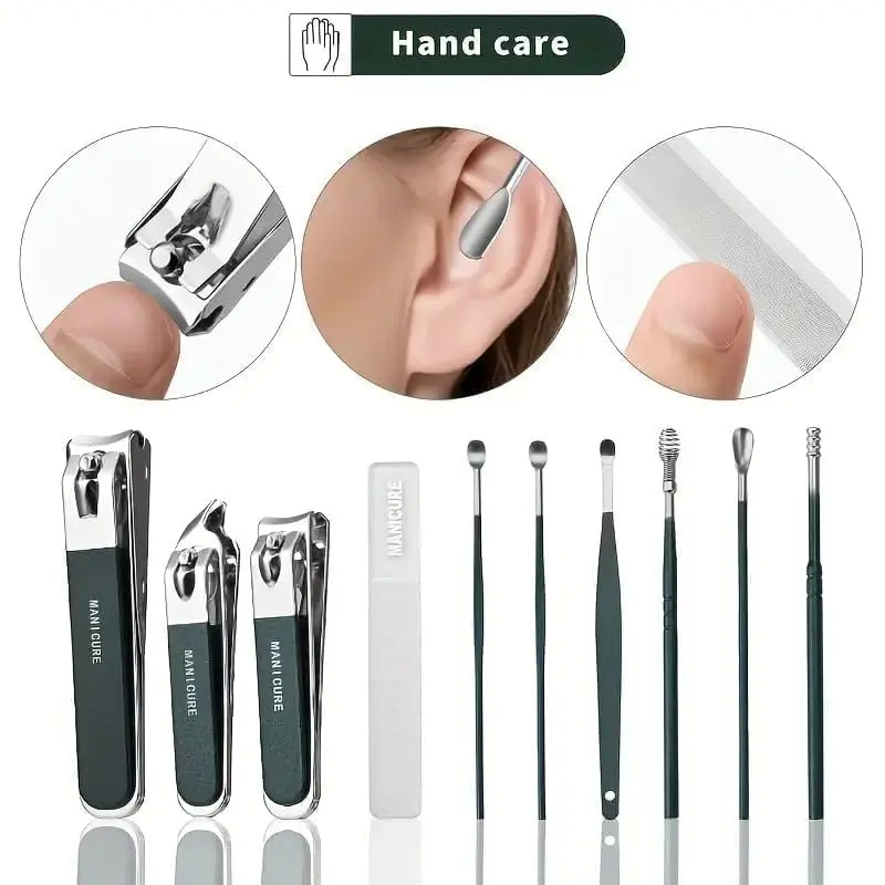 включає кусачки для нігтів на руках, кусачки для нігтів на ногах, пилочку для нігтів, інструменти для кутикули, засіб для чищення, пінцет і багато іншого для повного догляду за нігтями під час манікюр.