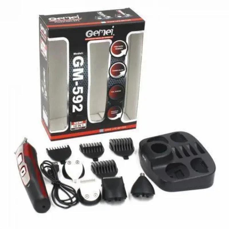 Електробритва Тример Машинка для стрижки 10 в 1 Gemei GM 592 чудовий подарунок для сучасного чоловіка, який стежить за своєю зовнішністю та любить у всьому акуратність та організованість. На цілісній підставці грамотно розташована сама машинка Gemei GM 592 і супутні аксесуари.