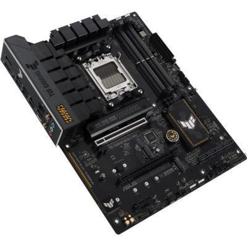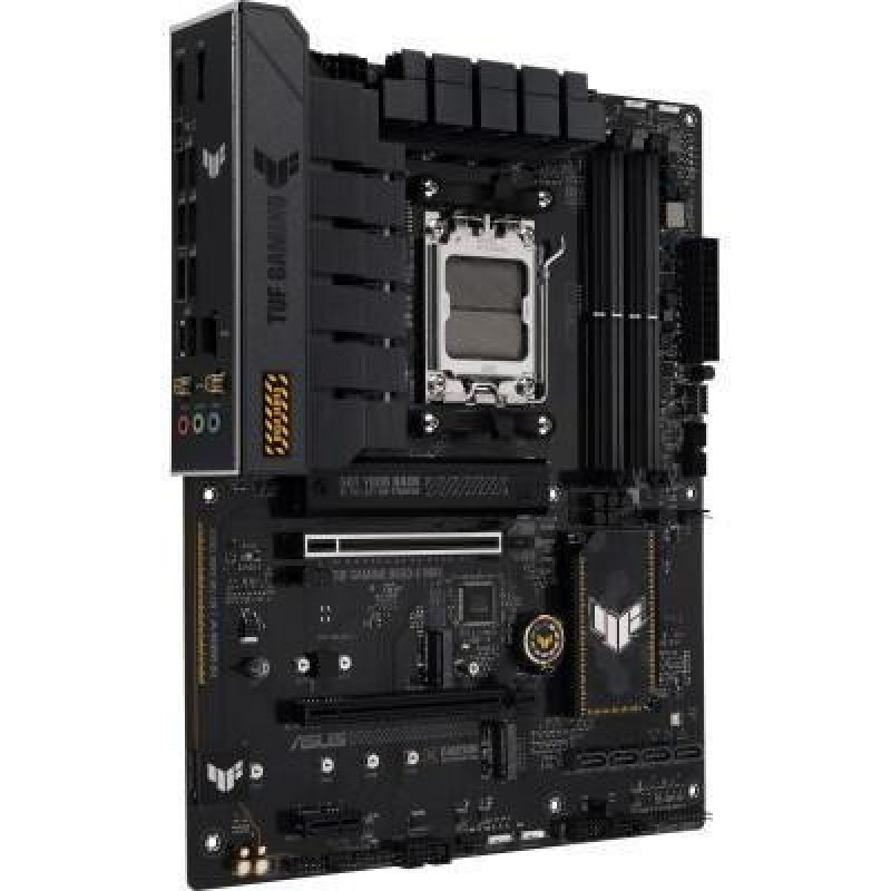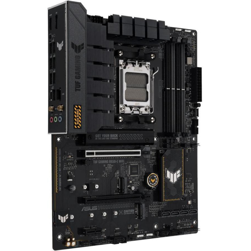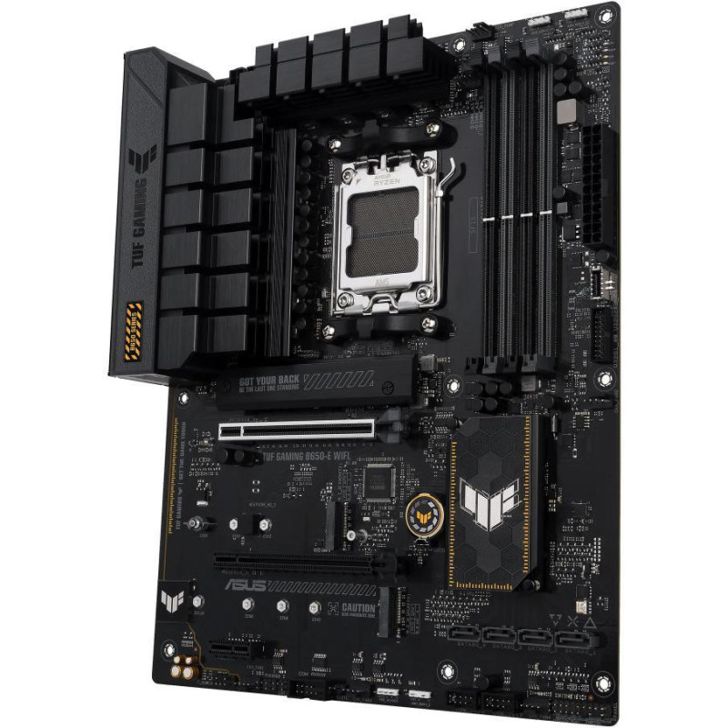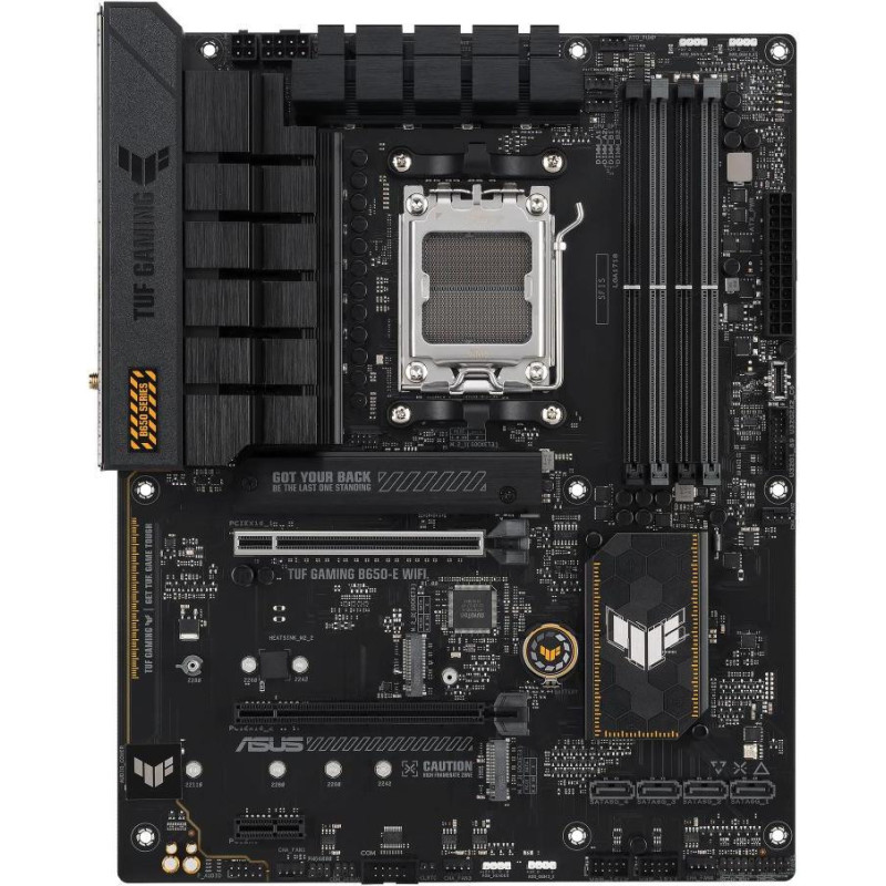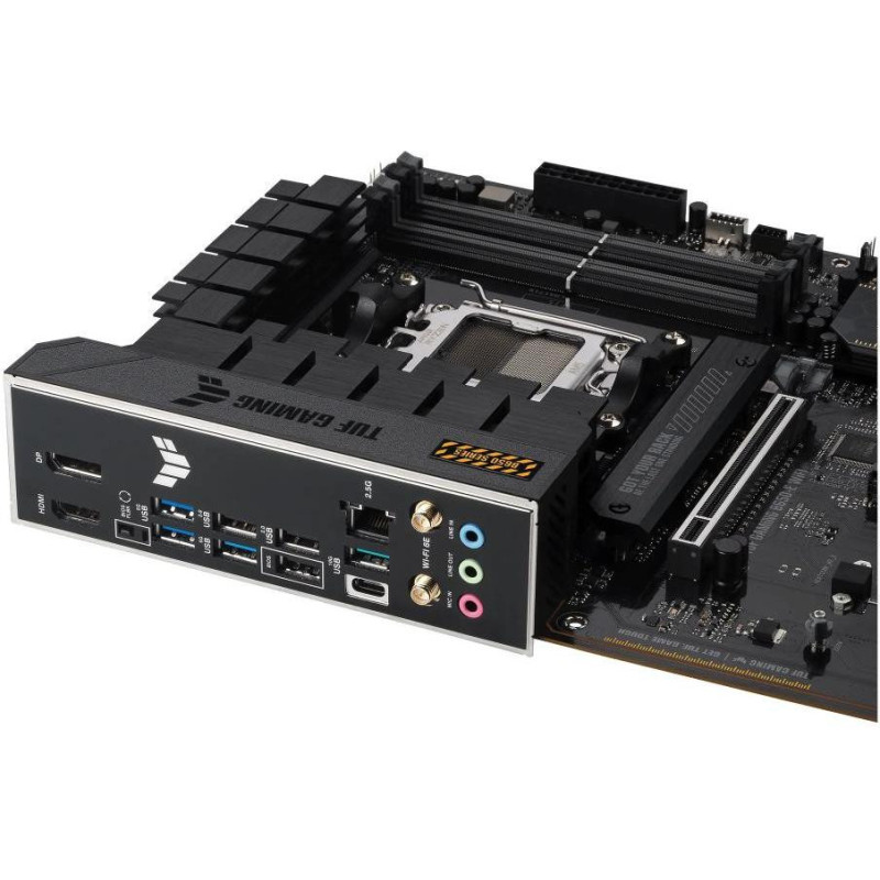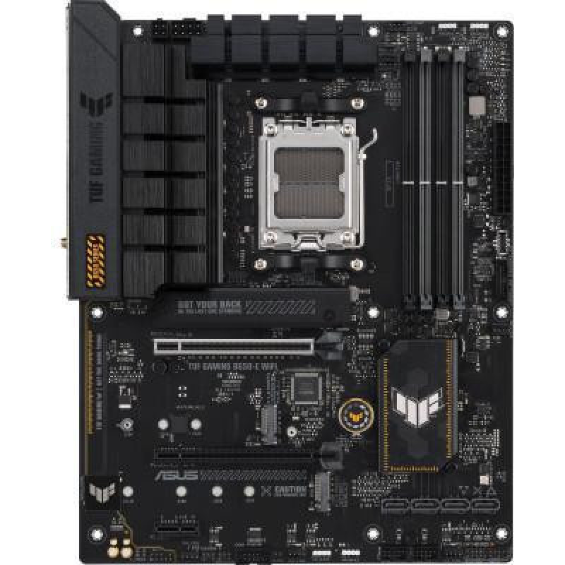 ASUS TUF GAMING B650-E WIFI (90MB1GT0-M0EAY0) - материнська плата формату ATX розміром 305 x 244 мм із процесорним роз'ємом Socket AM5 та чіпсетом AMD B650. Підтримується встановлення до 192 ГБ оперативної пам'яті DDR5 із частотою 8000+ МГц через чотири DIMM-слоти. Графічна підсистема реалізована через один слот PCI Express 4.0 x16 з повною пропускною здатністю та один PCI Express 4.0 x16, що працює в режимі x1. Також передбачено один слот PCI Express x1. Для підключення живлення використовується один 24-контактний та два роз'єми процесорного живлення: 8-контактний та 4-контактний. Система охолодження представлена радіаторами на VRM та чіпсеті. На платі встановлено сім роз'ємів для вентиляторів. ASUS TUF GAMING B650-E WIFI (90MB1GT0-M0EAY0) оснащена трьома слотами M.2: один із них підтримує PCI-E 5.0 x4, два - PCI-E 4.0 x4. Також є чотири порти SATA Revision 3.0 з підтримкою RAID 0, 1 і 10. В аудіопідсистемі використовується 7.1-канальний кодек Realtek з трьома аудіовиходами. Мережеві можливості представлені контролером Realtek з пропускною здатністю 2.5GbE, модулем Wi-Fi 6E (802.11ax) та Bluetooth 5.3. Для підключення дисплеїв передбачені виходи HDMI та DisplayPort. ASUS TUF GAMING B650-E WIFI (90MB1GT0-M0EAY0) включає роз'єми USB: один USB 3.2 Gen 2x2 Type-C, один USB 3.2 Gen 2 Type-C, один USB 3.2 Gen 2 Type-A, три USB 3.2 Gen 1 Type-A, три USB 3.2 Gen 1 Type-A, три USB 3.2 Gen 1 Type-A, три USB 3.2 Gen 1 Type-A, три USB 3.2 Gen 1 Type-A, три USB 3.2 Gen 1 Type-A, три USB 3.2 Gen 1 Type-A, три USB 3.2 Gen 1 Type-A, три USB 3.2 Gen 1 Type-A, три USB 3.2 Gen 1 Type-A, три USB 3.2 Gen 1 Type-A, три USB 3.2 Gen 1 Type-A, три USB 3.2 Gen 1 Type-A, три USB 3. 3.2 Gen 1 (на два порти) та два USB 2.0 (на чотири порти). Також реалізовано COM-порт. Конструкція включає посилений слот PCI-E, охолодження SSD M.2 та фаз живлення 8+2 по 60 А зі збільшеними радіаторами VRM.
