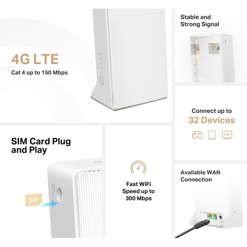 MERCUSYS MB110-4G – бездротовий маршрутизатор N300 із підтримкою 4G/LTE. Забезпечує швидкість Wi-Fi до 300 Мбіт/с (2,4 ГГц), має порт WAN/LAN Fast Ethernet та окремий LAN-порт, слот для Nano-SIM та роз'єми для зовнішніх антен.