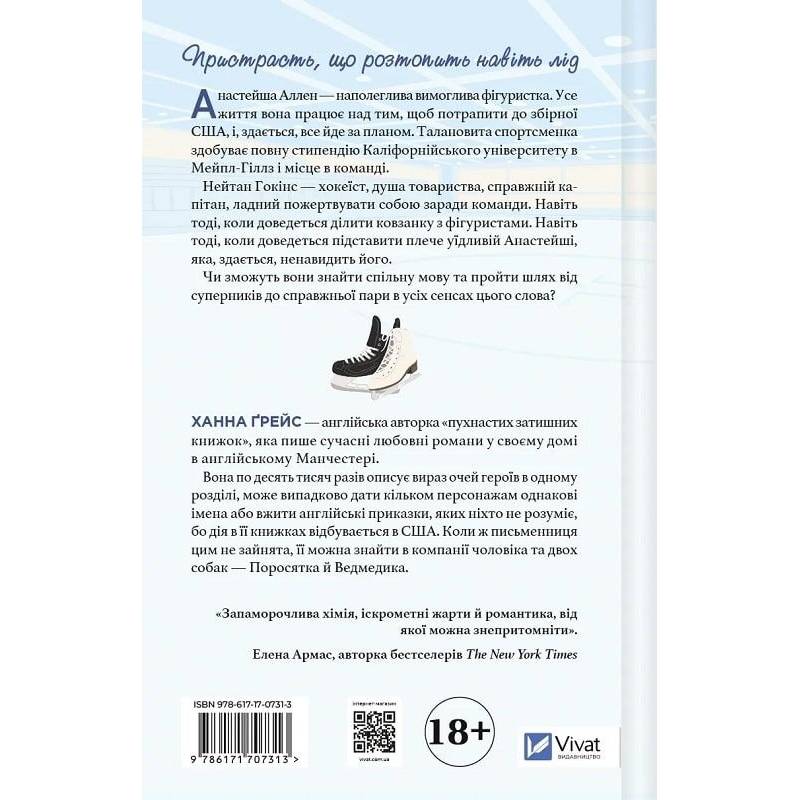 Анотація: Анастейша Аллен — наполеглива вимоглива фігуристка. Усе життя вона працює над тим, щоб потрапити до збірної США, і, здається, все йде за планом. Талановита спортсменка здобуває повну стипендію Каліфорнійського університету в Мейпл-Гіллз і місце в команді.