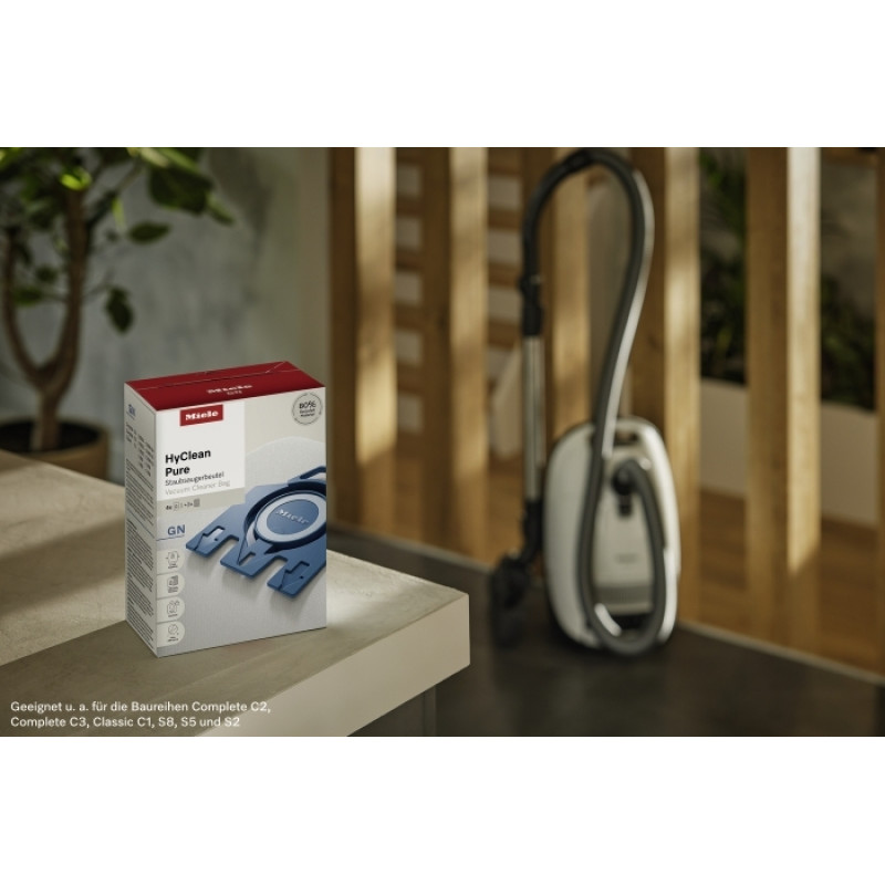 Мішки для пилососів Miele GN HyClean Pure (41996720INT) – це оригінальні пилозбірники об'ємом 4.5 л, призначені для моделей Miele Complete C2, Complete C3, Classic C1, S8, S5, S2. У комплекті 4 мішки, 1 моторний фільтр та 1 випускний фільтр. Виготовлені з 80% перероблених матеріалів, вони забезпечують фільтрацію 99.99% дрібної пилки завдяки системі AirClean. Оснащені технологією 3D Efficiency та автоматичним закриттям HyClose, мають тривалий термін служби (до 3 місяців).