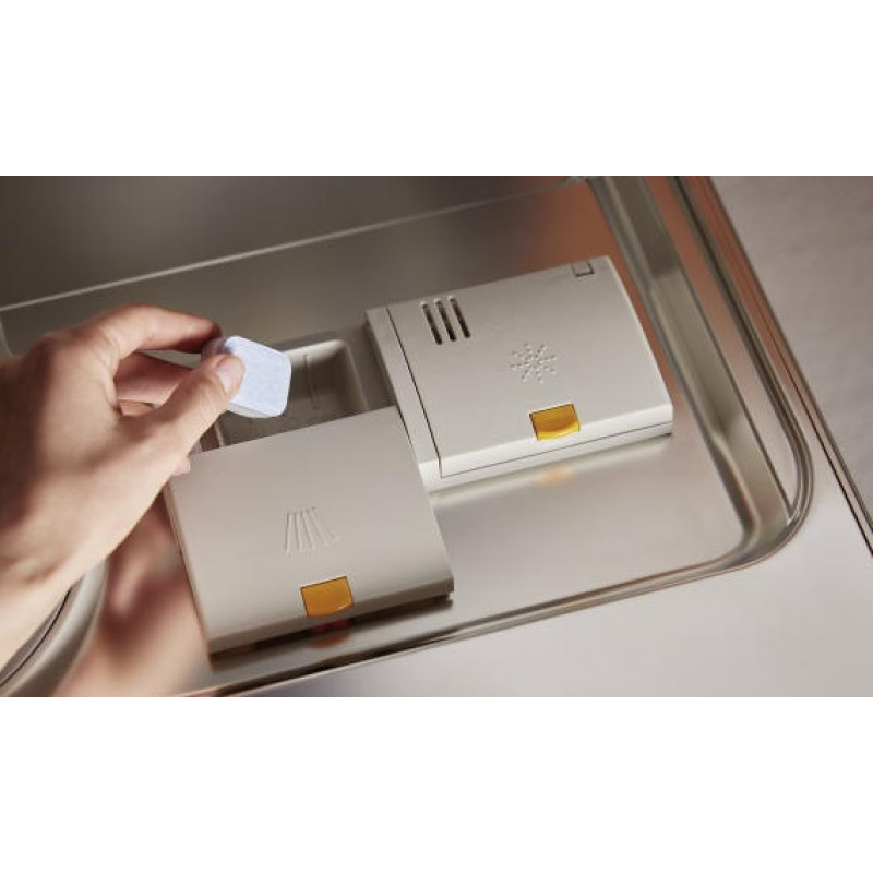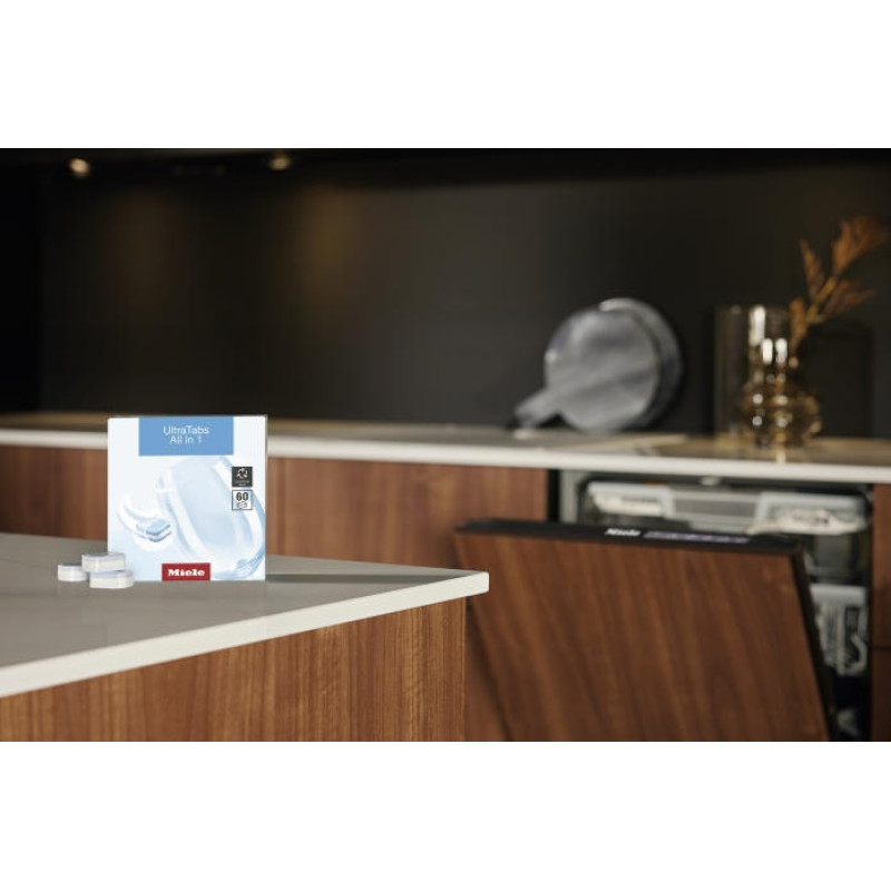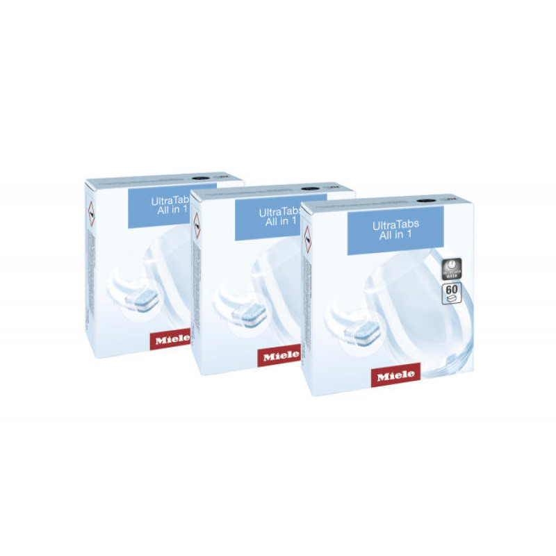 Miele Ultra Tabs All in 1 – це 180 пігулок для посудомийних машин у водорозчинній плівці. Вони ефективно видаляють навіть стійкі загрязнення та одночасно діють як миючий засіб, ополіскувач і сіль. Спеціальна формула захищає скло від пошкоджень, попереджає утворення плям на сталі та сріблі, а також зменшує відкладення жиру в машині.