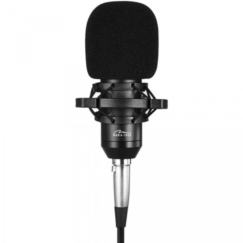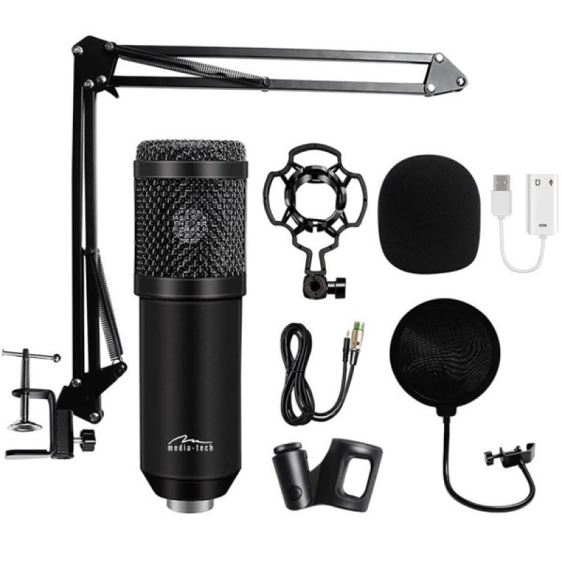 Ігровий стрім мікрофон Media-Tech професійний набір XLR - це набір для потокового і студійного запису звуку. Він включає в себе конденсаторний мікрофон, регульовану настільну підставку, поп-фільтр, антивібраційний кошик, губчастий обтічник, зовнішню звукову карту та проводку.