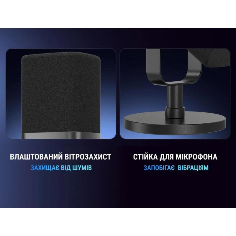 | Додатково | Рlug-and-play підсвічування; кнопка вимикання мікрофона; кнопка регулювання RGB підсвічування; роз'єм для навушників; антивібраційна підставка; можливість регулювання рівня вихідного сигналу прямо на мікрофоні; підключення по XLR |
