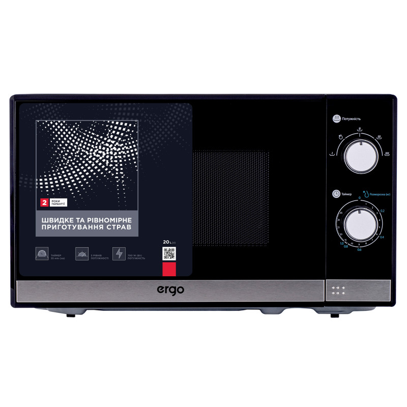 Мікрохвильова піч ERGO ЕМ-2040 - зручний і функціональний помічник на офісній або домашній кухні. Зрозуміле механічне керування сподобається поціновувачам простих, але надійних речей, а корпус чорного кольору - тим, кому важливий стиль.