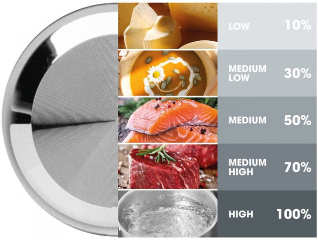 Середня потужність підходить для приготування на пару або смаження. Низька потужність більш щадна, але при цьому продукти можуть втрачати вологу.