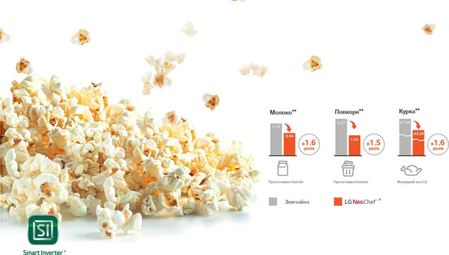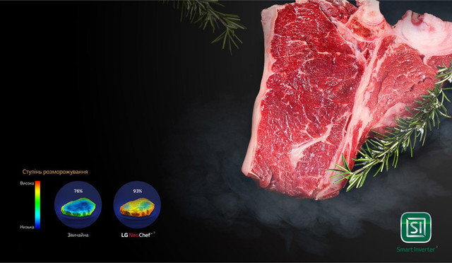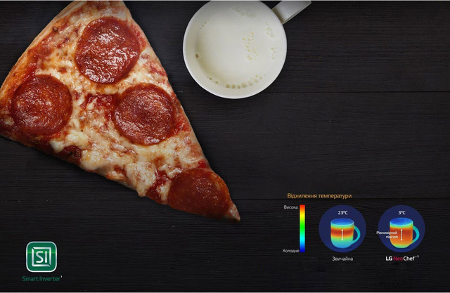 Мікрохвильова піч LG NeoChef c технологією Smart Inverter. Завдяки високій потужності в 1000 Вт і точності керування продукти розморожуються, підігріваються і готуються більш ефективно, а страви порадують вас різноманітністю.