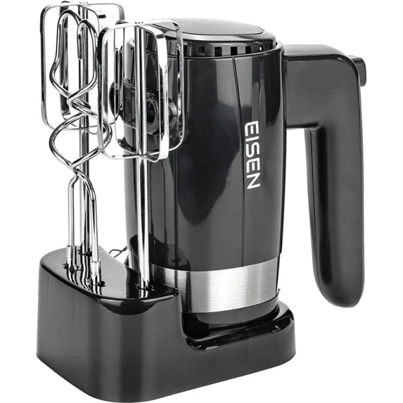 Ручний міксер Eisen EHM-50 — це ефективний і продуманий інструмент 2 в 1, здатний виконувати широкий спектр кулінарних завдань. Потужність 500 Вт забезпечує високу продуктивність, що дозволяє легко збивати, змішувати й замішувати інгредієнти різної густини — від ніжних кремів до щільного тіста.У комплект входять 2 вінчики для збивання та 2 гаки для тіста, що робить модель універсальною у використанні. Пять швидкостей і турборежим дозволяють налаштовувати інтенсивність роботи під конкретний рецепт. Головна перевага — підставка для зберігання, яка допомагає тримати насадки та міксер в одному місці, економить простір і захищає деталі.Пристрій оснащений захистом від перегріву, має низький рівень шуму, а ергономічна форма та зручно розташовані кнопки дозволяють комфортно керувати приладом однією рукою. Корпус виготовлений із якісного пластику, а довжина шнура забезпечує достатню свободу рухів під час роботи.ХарактеристикиКількість швидкостей: 5Потужність: 500 ВтТип: ручнийВага в упаковці: 0.75 кгМатеріал корпуса: пластикКолір: чорний