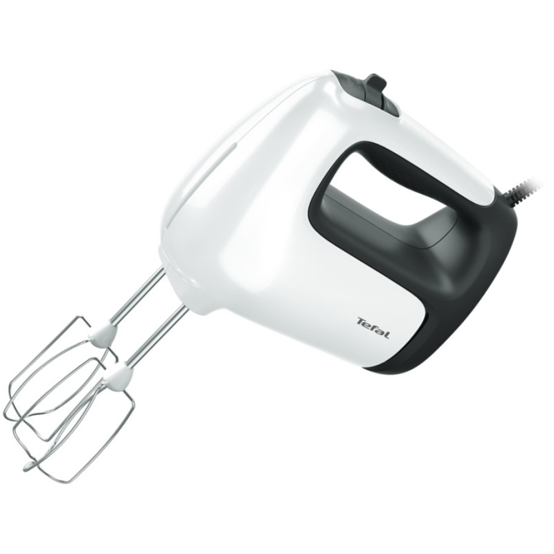 Ручний міксер із серії Tefal Prep'Mix відразу ж привертає увагу своїм зовнішнім виглядом: виробник вибрав безпрограшне поєднання білого та чорного кольорів, яке підходить практично під будь-який інтер'єр кухні. Невелика вага і ергономічна ручка роблять використання комфортнішим навіть при тривалій роботі, а плоска основа дозволяє приладу займати стійке вертикальне положення. Але зовнішній вигляд не є головною та єдиною перевагою моделі. Насамперед це багатофункціональний пристрій, який може виконувати роль як міксера, так і занурювального блендера. Для цього до комплектації Tefal Prep'Mix+ HT4621 входить металева насадка-ніжка з гострими лезами, яка допоможе швидко подрібнити та змішати інгредієнти. З її допомогою можна готувати домашні соуси, дитяче харчування, суп-пюре, заправки для салатів та ін. Доповнює ніжку блендера мірна склянка, в якій можна не лише відміряти необхідну кількість інгредієнтів, а й готувати невеликі порції. Сам міксер оснащений стандартними насадками: двома віночками для збивання та двома гаками для замішування тіста. Усі знімні насадки можна мити в посудомийній машині. Потужність пристрою складає 500 Вт - це цілком достатньо для роботи з рідким тістом і щільнішими, густішими масами. Налаштування теж досить прості та зрозумілі: є 5 швидкостей та окремий турборежим, який моментально збільшує потужність до максимальних показань.