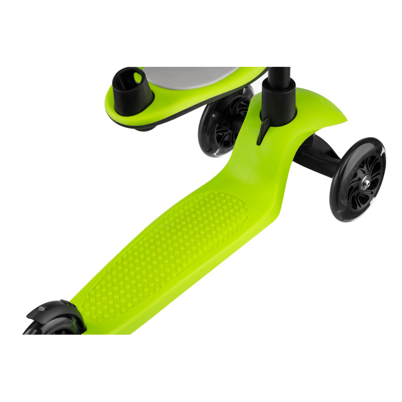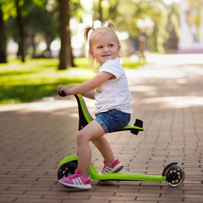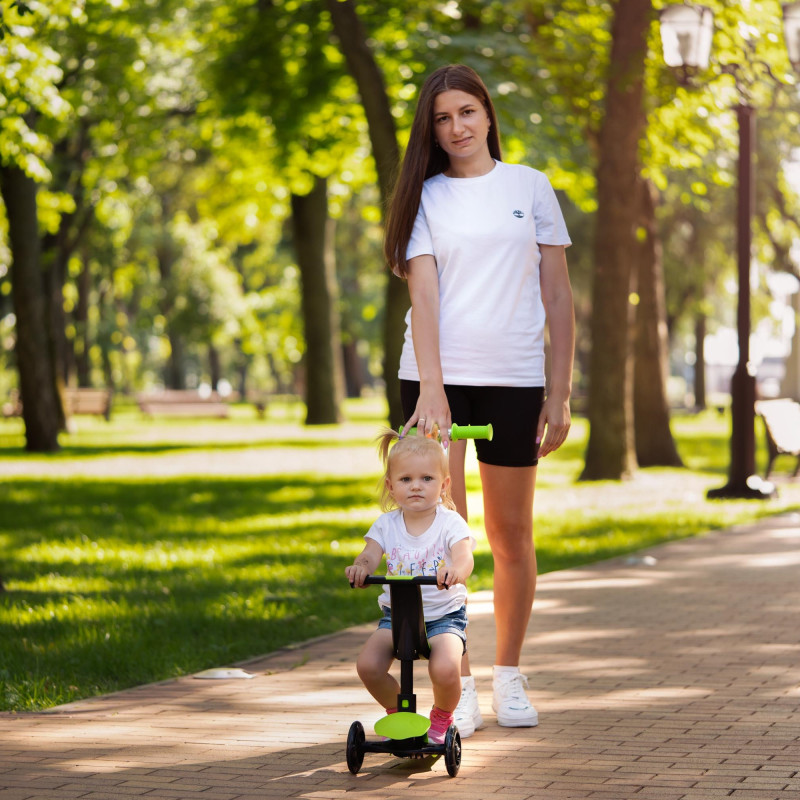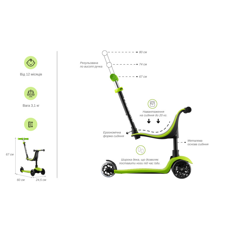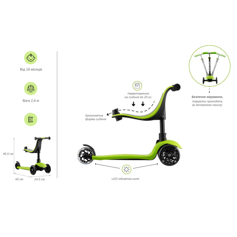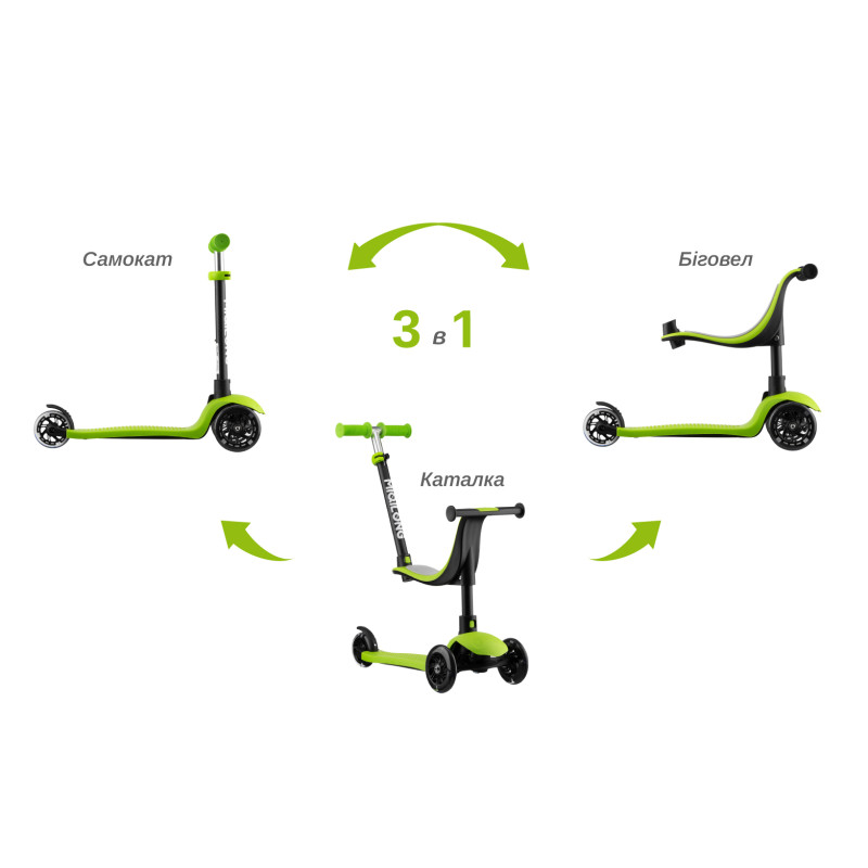 Дитячий триколісний самокат із сидінням та батьківською ручкою. Трансформується в каталку з батьківською ручкою, біговел із сидінням та 3 колісний самокат.