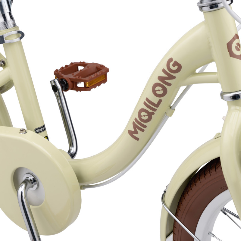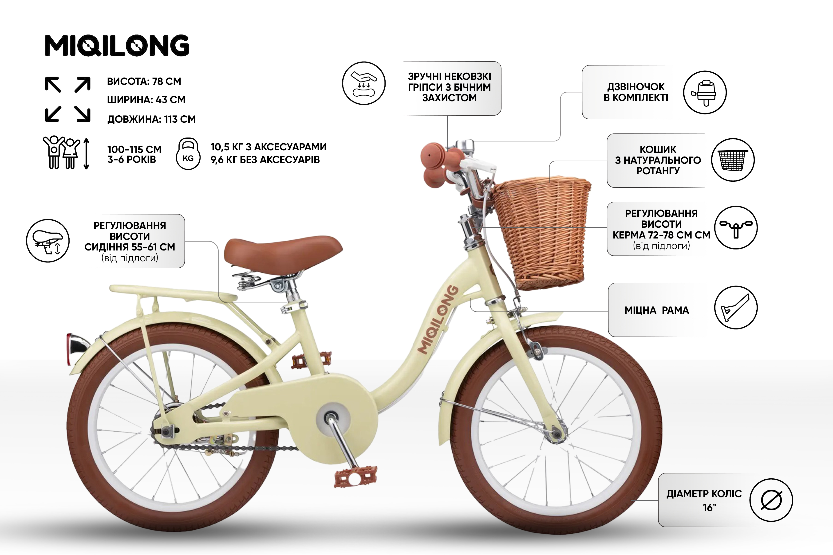 Велосипед для дітей Miqilong LS 16 - це втілення сучасного уявлення про ретро дизайн. Використання фарбування у стилі 50-х років ХХ століття та корзинки ручної роботи з натурального ротангу роблять дизайн велосипеда вишуканим та елегантним.