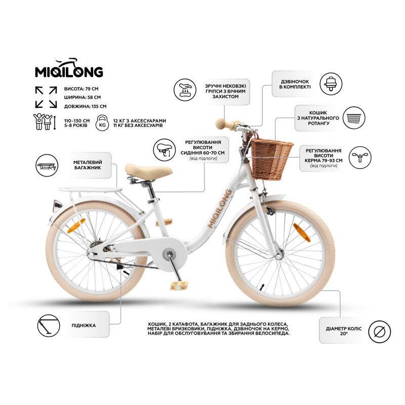 Велосипед для дітей Miqilong LS 20 - це втілення сучасного уявлення про ретро дизайн. Використання фарбування у стилі 50-х років ХХ століття та корзинки ручної роботи з натурального ротангу роблять дизайн велосипеда вишуканим та елегантним.