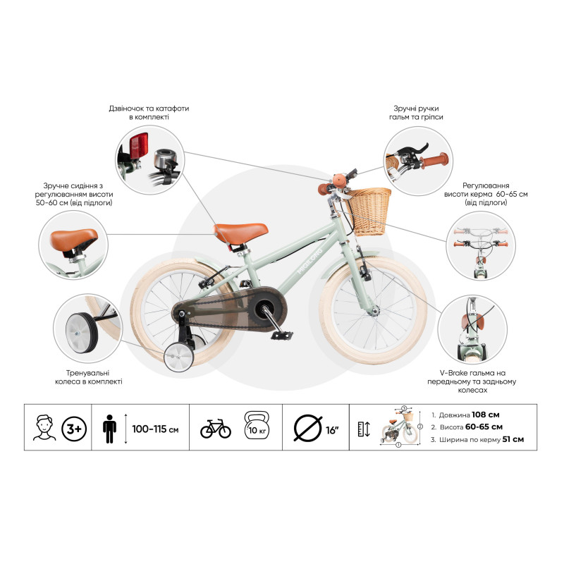 | Оснащення | 2 додаткові бічні колеса, Сигнальний дзвіночок, Сидіння, Корзинка, Набір інструментів, 2 катафоти |