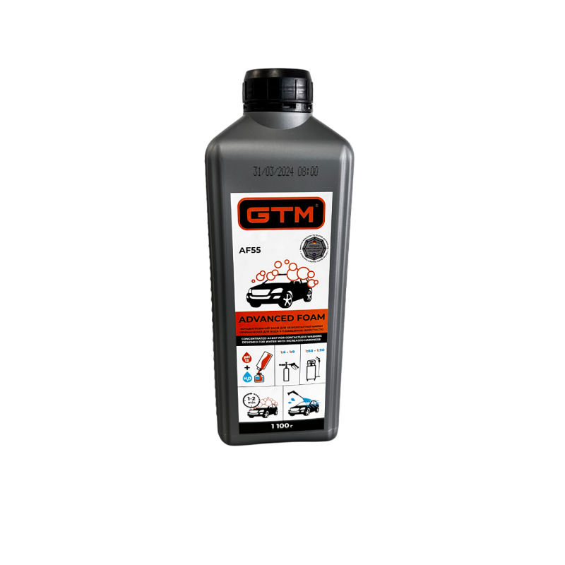 GTM Advanced Foam AF55 - концентрований високопінний засіб для очищення поверхні від усіх видів забруднень, включно з дорожнім пилом, паливним забрудненням або залишками комах. Застосовується для всіх видів безконтактного миття автомобілів, велосипедів і мотоциклів. Надає поверхні блиск без розводів. Піна безпечна для лакофарбового покриття, пластмас, гуми та металів.